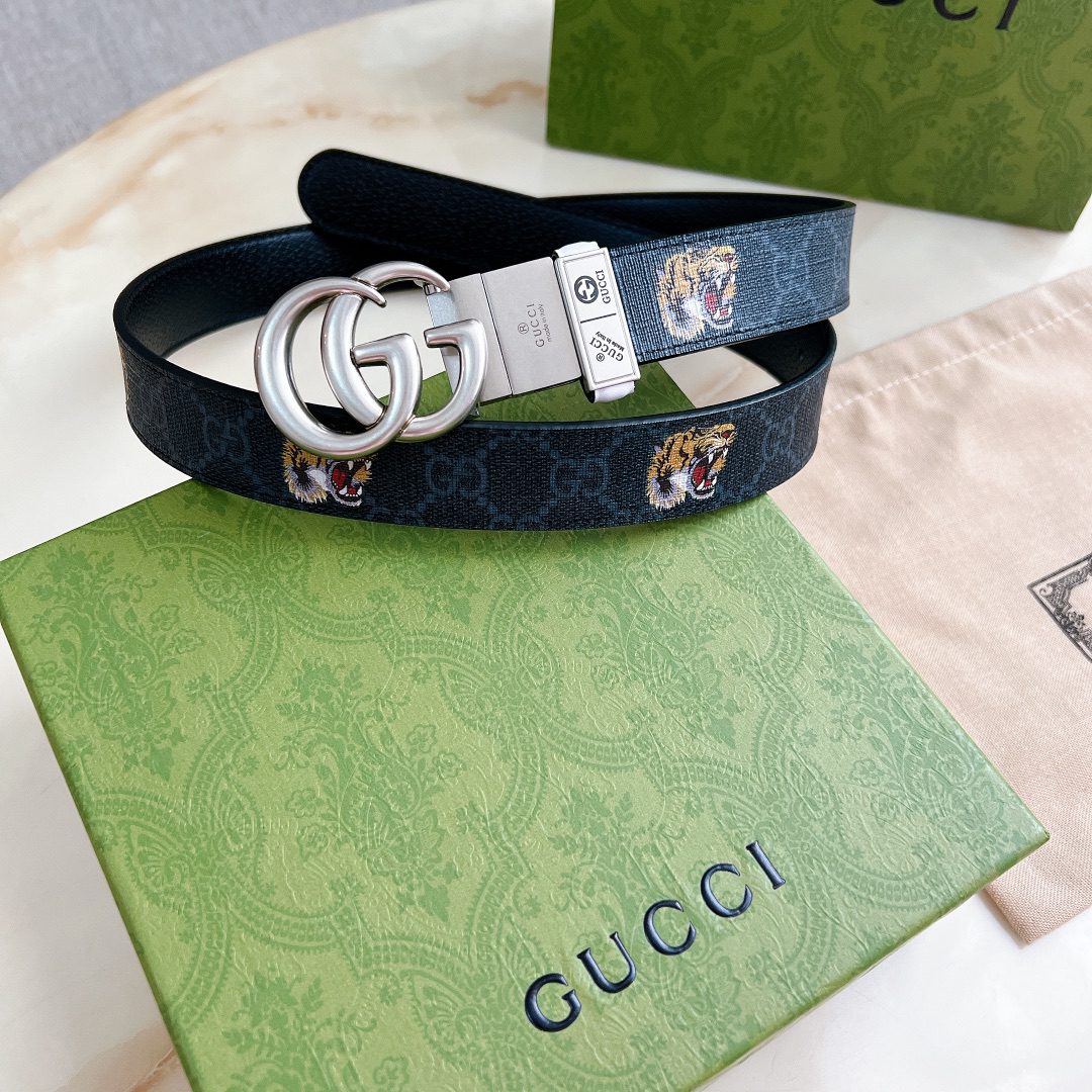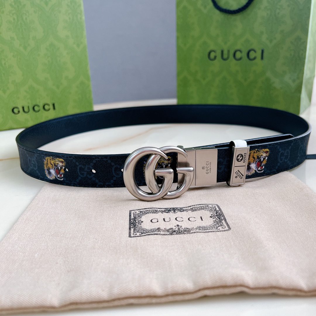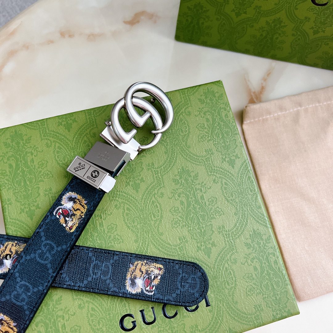 Gucci, width cm, new style reversible leather belt with print and pigskin texture. Accessories continue to lead the trend of Gucci’s new series, demonstrating outstanding quality with unique rich details and practical functions. The highly recognizable double G buckle element makes the entire belt more attractive D