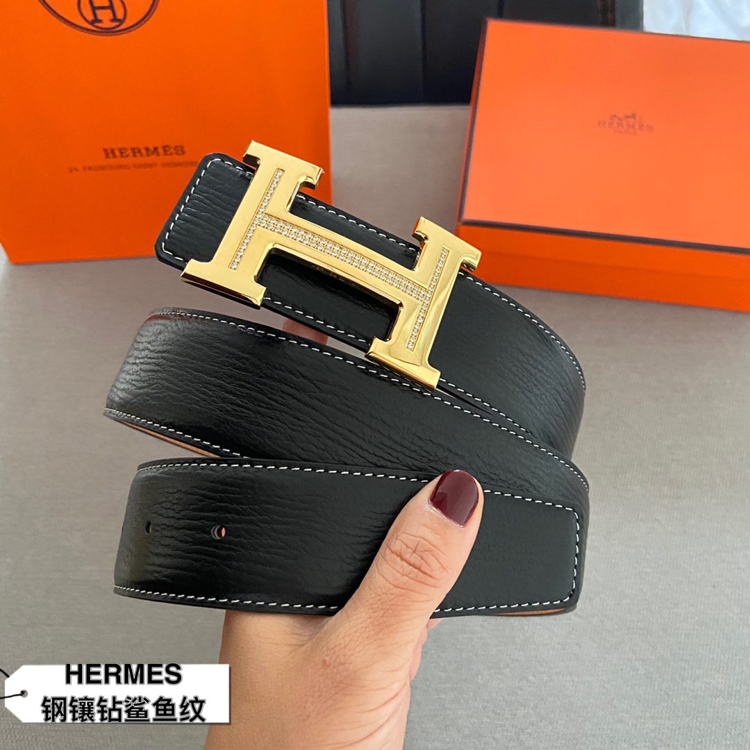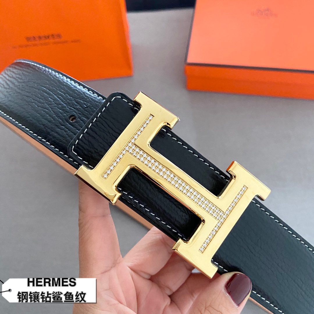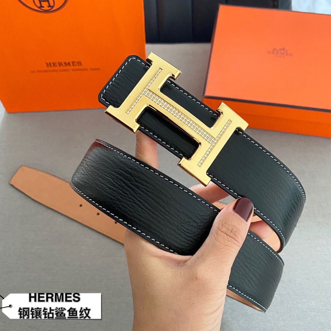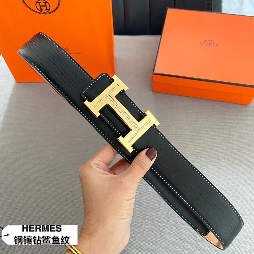 Home Belt Belt Hermes (Hermes) cm double-sided original leather, steel buckle with diamond shark 🦈 pattern Hermes
