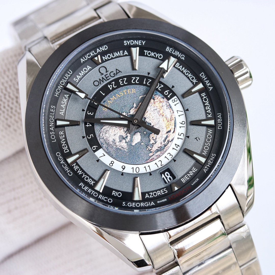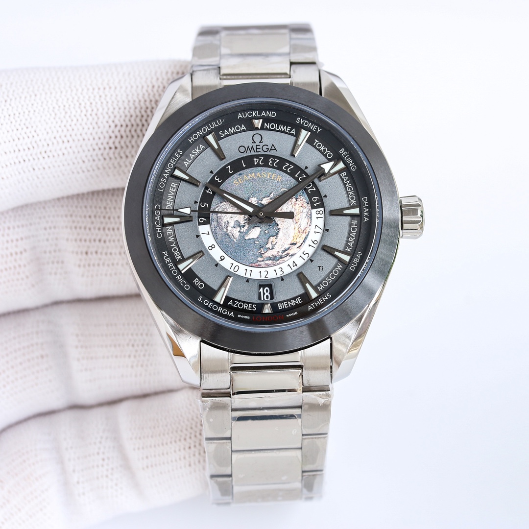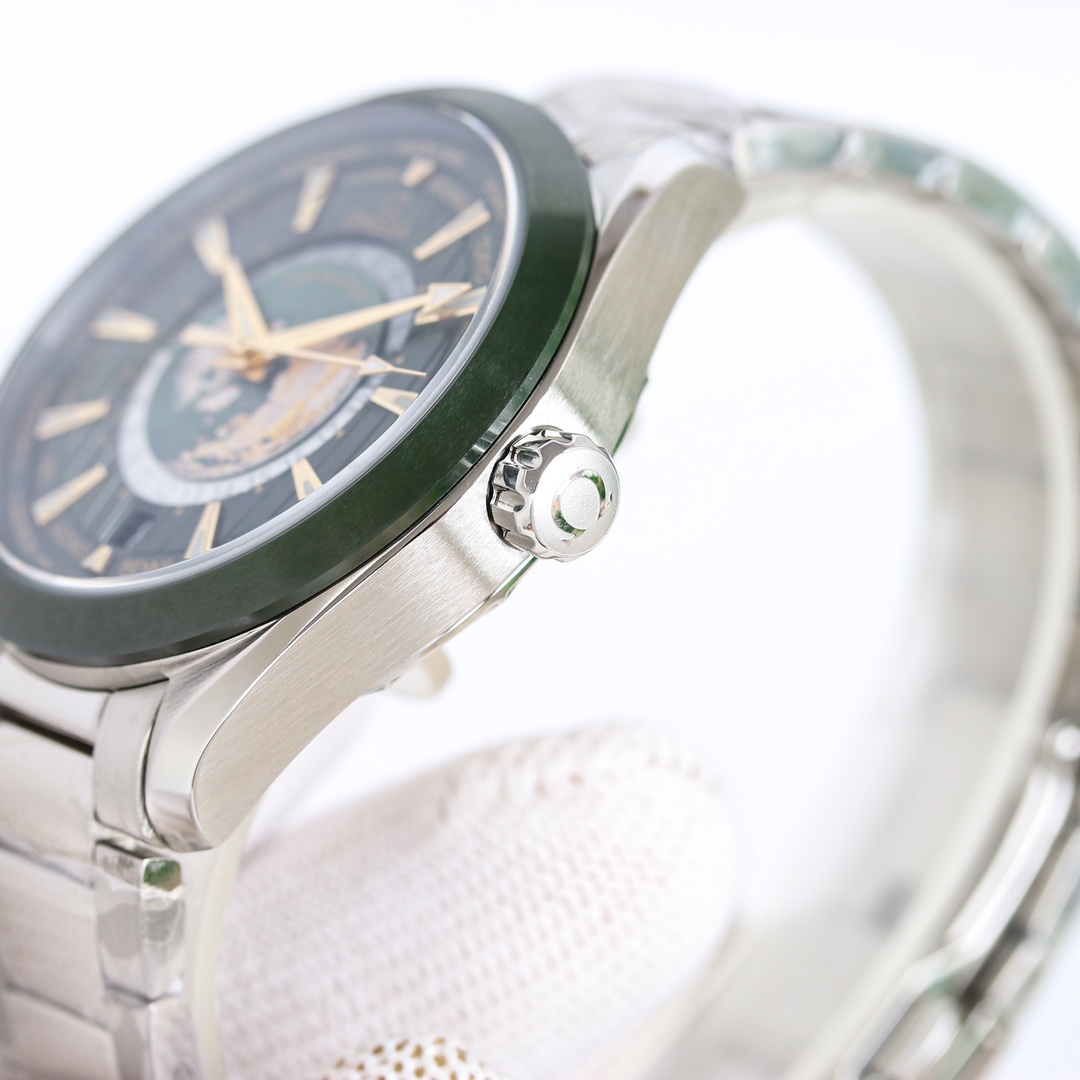 [Highest quality version] New OMEGA Seamaster series CM [Different from the ordinary version on the market, the world time can be adjusted individually and quickly] [Mirror]: Sapphire crystal glass Air double-layer colorless coating [Air coating makes the mirror more transparent, and the time can still be read under strong light] [Pointer]: Stainless steel polished pointer {No copper embryo pointers are used, because the polished steel pointer does not require electroplating after processing, the process is difficult and the cost is high. But the three-dimensional effect is extremely strong. The polished cut surface is smoother [Dial]: All textures are formed in one piece, fully reflecting its three-dimensional effect. It is composed of multiple layers of dials that are overlapped and fixed. The northern hemisphere world time in the center of the dial is made of enamel technology, and the overall dial presentation is very perfect. Aqua Terra brings the ‘Colored Earth’ to the dial. This unique design is also quite explosive in the watch circle! SJ exquisitely recommends men’s mechanical watches