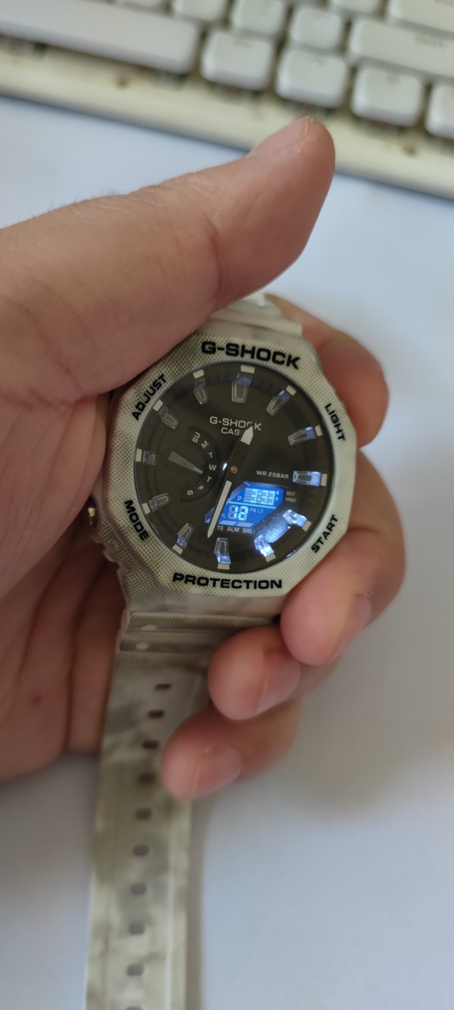 Hot sale! Casio G-SHOCK’s new small cube ice tough series! The new GA-20 Casio octagonal model, ultra-thin dial, sourced from Xiaohongshu channels, the mirror becomes transparent when exposed to water, single-buckle strap design, simple display screen, and the chance of being tested by the Dewu (Poison) APP. If you want to get one, place an order now! Main functions: shockproof, meter waterproof, high-brightness automatic LED lighting, world time (48 cities), stopwatch (0 seconds), 24-hour time format, daily alarm, hourly chime, countdown, fully automatic calendar