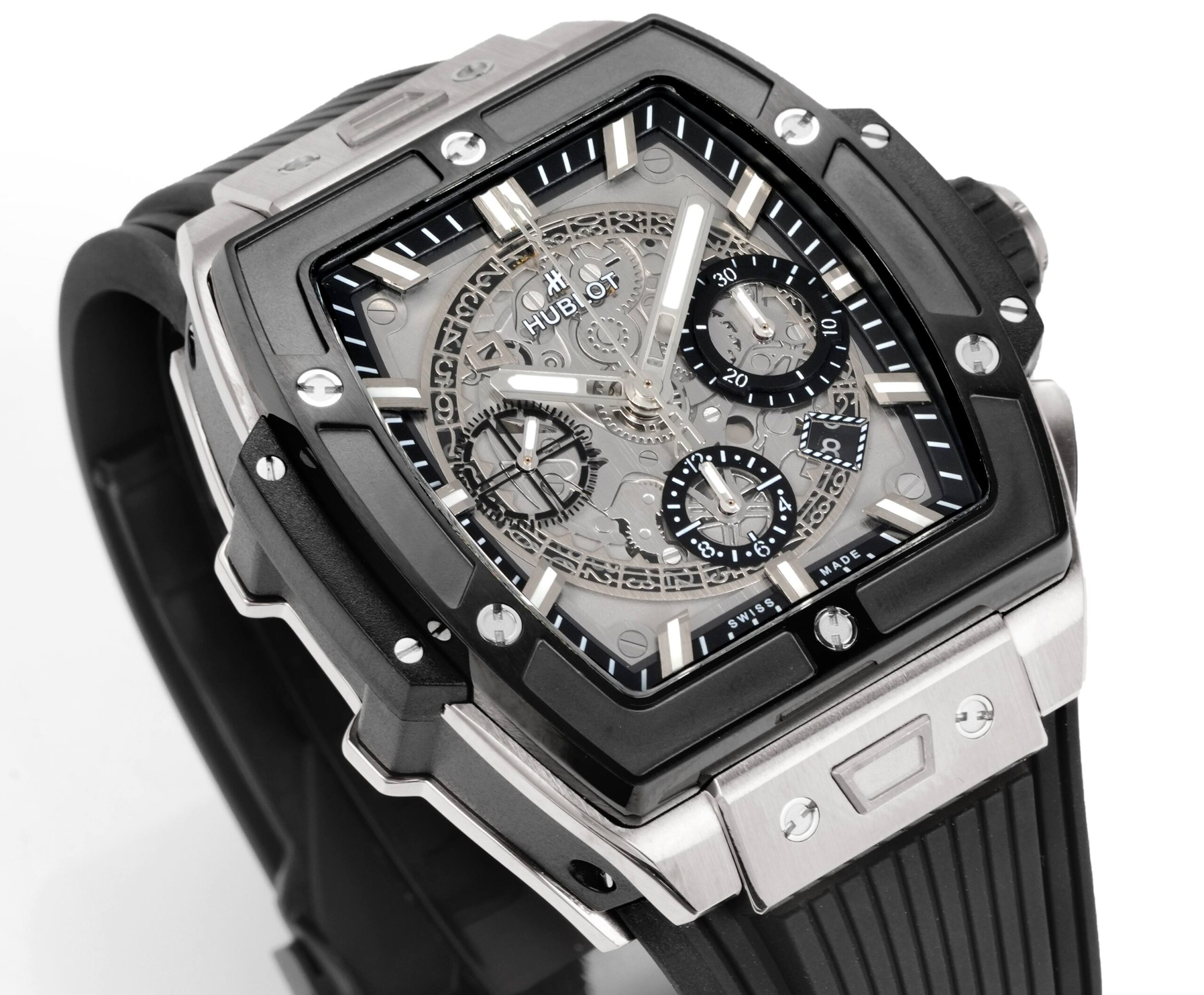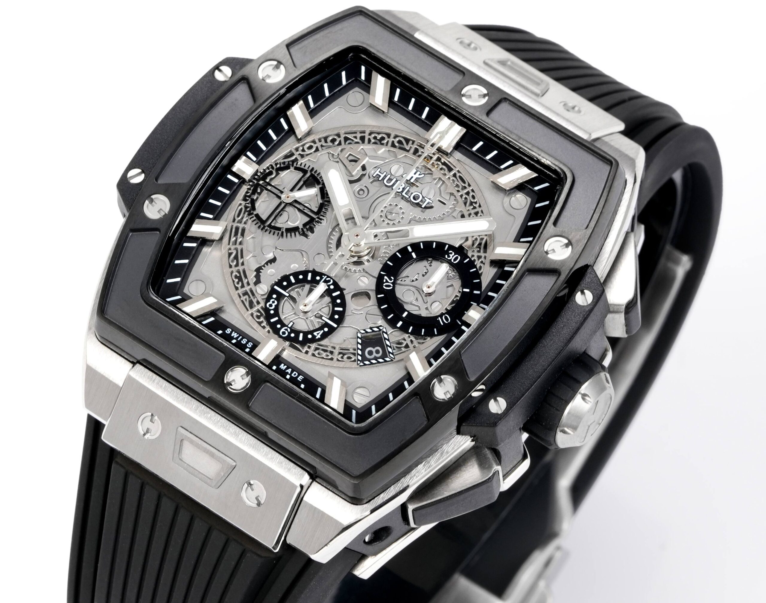 Hublot HUBLOT soul series BIG BANG series. Model 642.NX.0.RX is inspired by racing and launches a new Spirit of Big Bang limited edition watch! The watch combines all the iconic elements of the Spirit of Big Bang series with a new barrel-shaped case. The case is made of titanium and resin materials, using six H-shaped screws to build a “sandwich” structure, conveying the concept of “fusion of technology”, perfectly replicating the exclusive customized HUB4700 movement, upgrading the original folding clasp, and customizing the fluororubber strap. The watch is equipped with a “one-click” quick strap replacement system, and the wearer can easily and quickly replace the strap with just one click! Ceiling level. Players are welcome to taste it! ! !