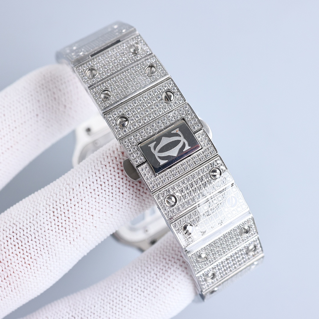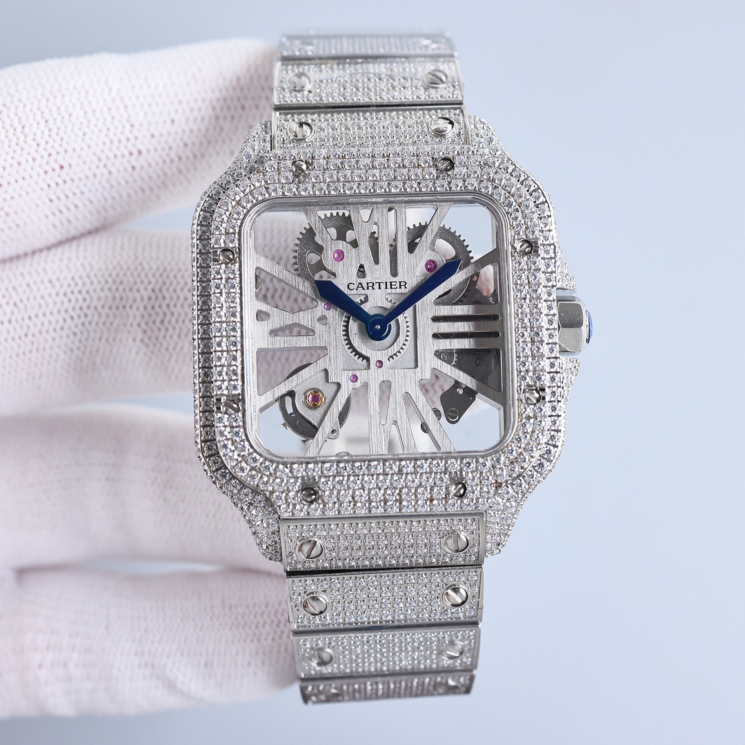 Kajia Santos Skeleton Series is the first to create the most powerful modified quartz movement. Case thickness: 9.08 mm. Dial color: Skeleton Dial shape: Square SKU: Black Silver silver ring Silver rose ring Silver gold ring Strap color: Black Blue Brown Green (Imported calfskin) Buckle type: Double folding buckle Back transparent: Back lens Mirror: Sapphire mirror Pointer: Blue burnt steel blue pointer The black model uses imported green luminous crown: gem-set crown