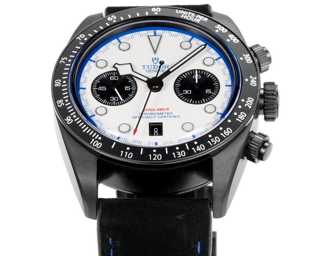 Type automatic winding movement (COSC certified), equipped with column wheel, vertical clutch system and silicon hairspring, ultra-high power reserve, accuracy of -2_+4 seconds_days. Functions: chronograph, date display, small seconds, smooth and practical operation. Tudor slogan: Born to dare