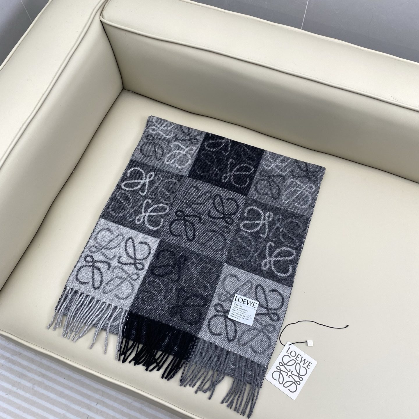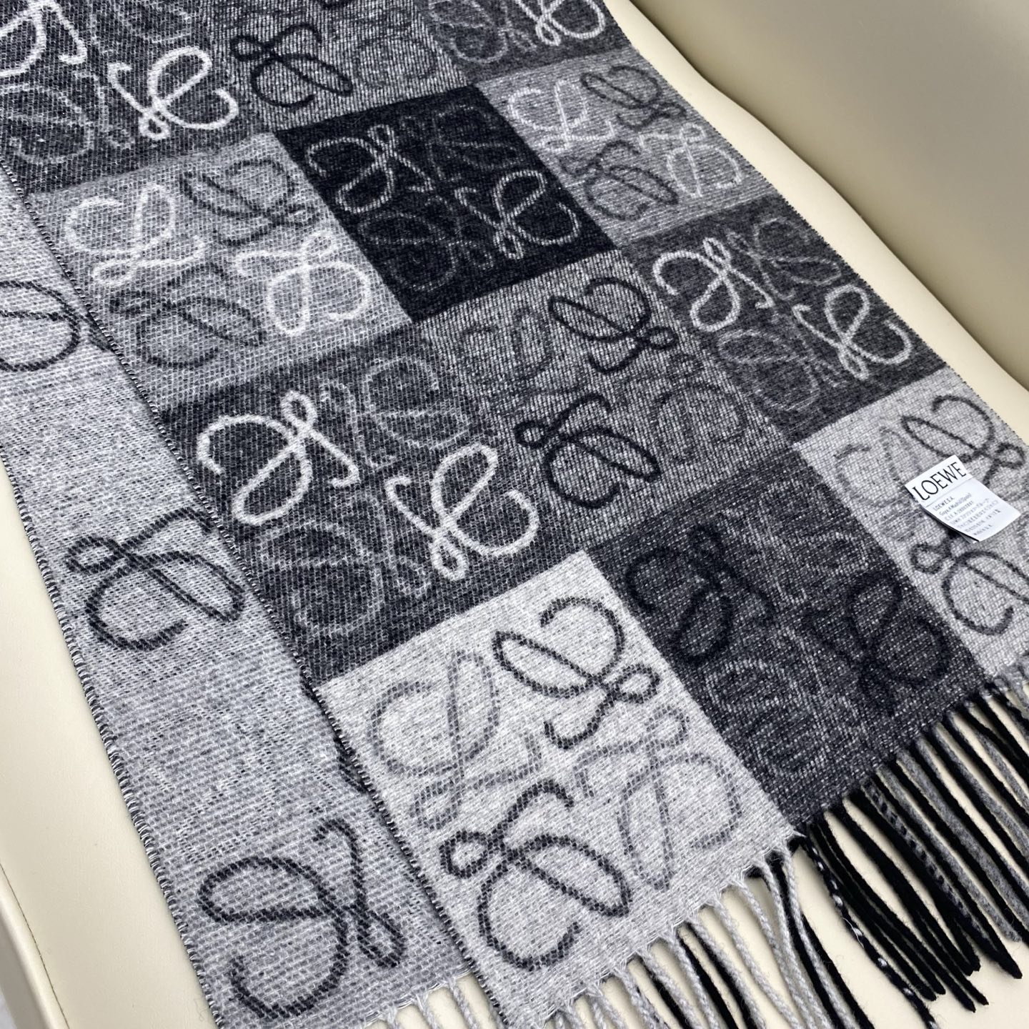 Loewe checkerboard jacquard scarf. Classic checkerboard matrix design. Sheep wool fabric. Comfortable and easy to care for. Labels are divided into domestic and overseas versions (domestic with washing water label, foreign countries without white washing water label). Same style for men and women. Classic and versatile. Specification 40cm.