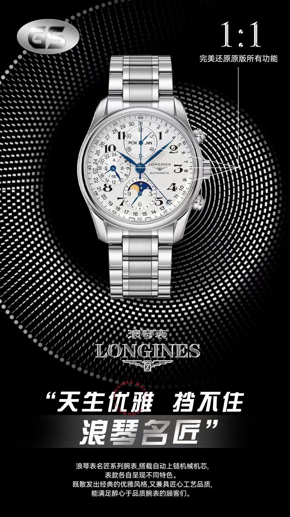 LONGINES famous craftsman eight-hand moon phase ZF1 chronograph movement, all functions are real functions and can be used, baked blue hands, sapphire crystal mirror, the back cover is also sapphire crystal, the automatic rotor is finely polished and super waterproof [Deyi] [Deyi] You can enter the counter without any pressure! Produced by GS factory, actual shipment photos. SJ exquisitely recommends men’s multi-functional mechanical watches.