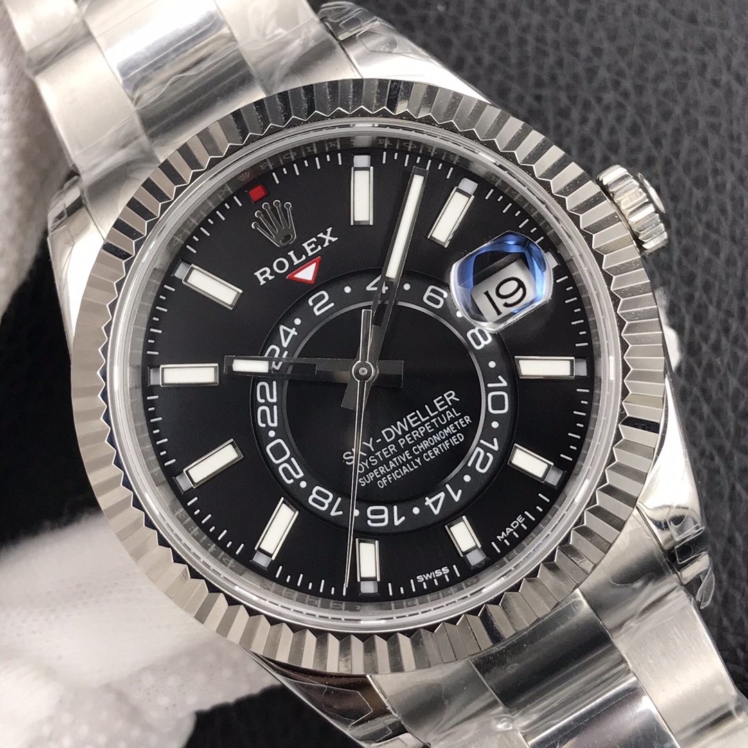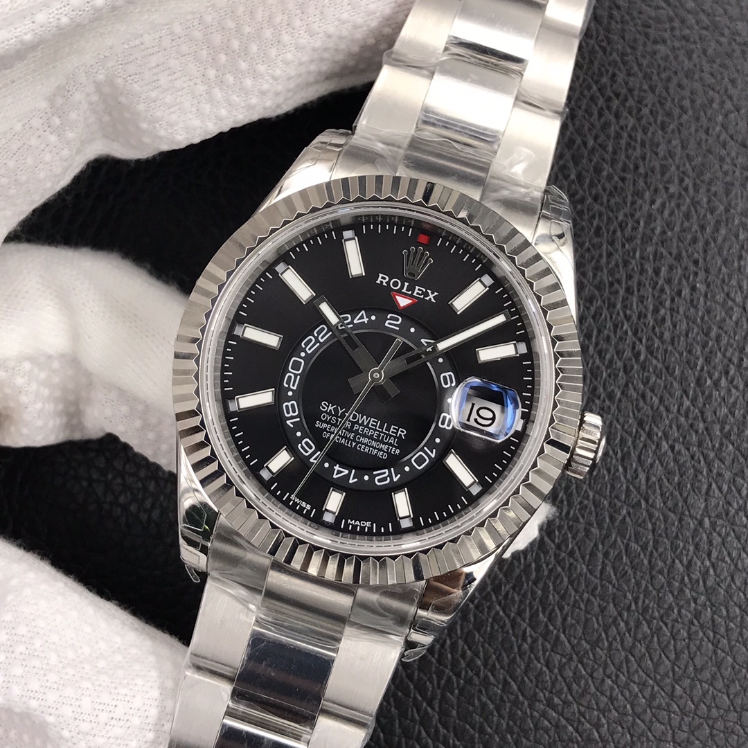 Lux Rolex Sky-Dweller Skywalker! [Case] ​​Size 42MM, stable, reliable, graceful and generous! The bezel adopts the Rolex Ring Command triangular groove pattern, and the month function can be adjusted by rotating the outer ring! Scratch-resistant sapphire crystal, anti-reflective convex magnified calendar window [Strap:] (Oyster steel), Oyster, three rows of links Oyster discount with 5mm easy-adjustable link extension system [Dial] Sun-ray texture, scale 01 movement [Function] Date display Month display Annual calendar display Dual time zone