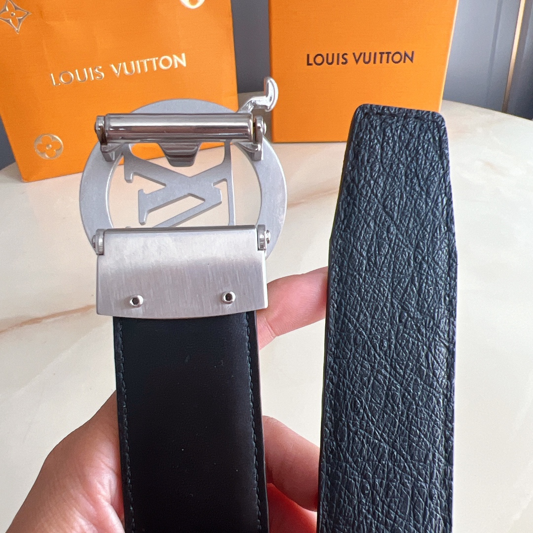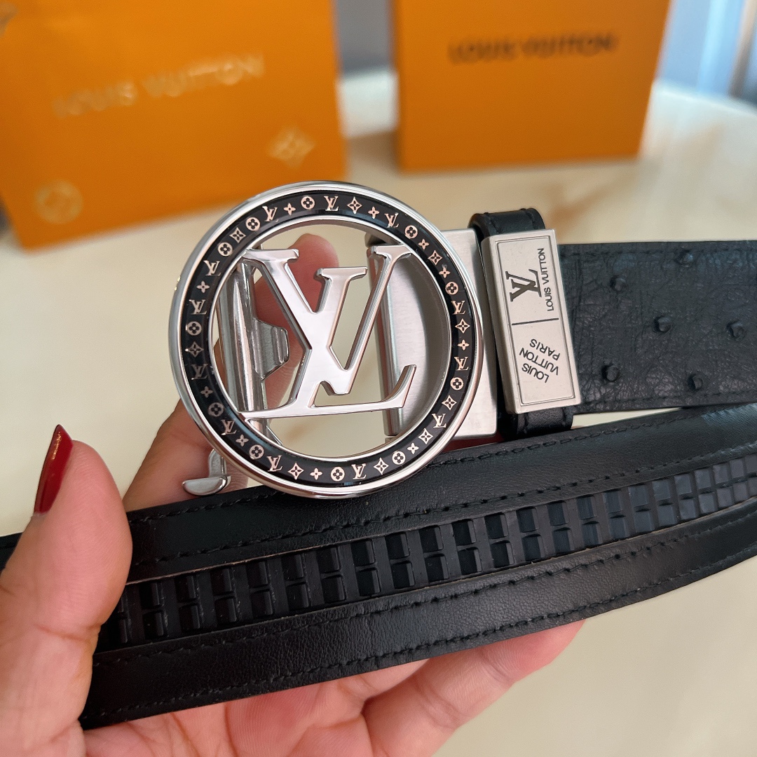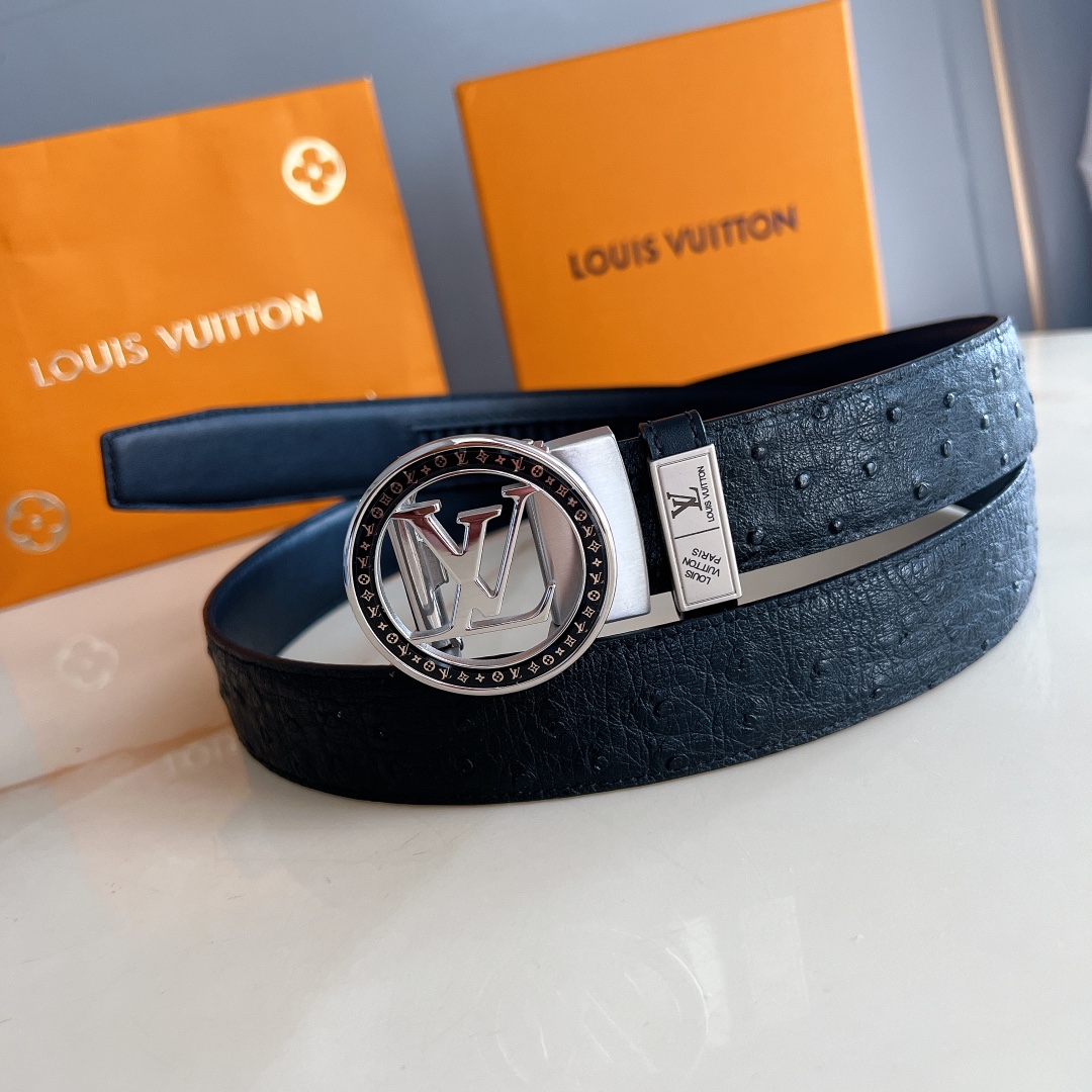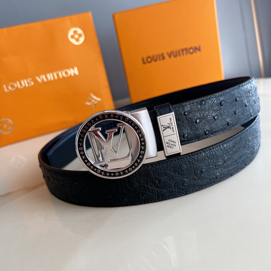 LV automatic belt steel buckle original leather ostrich leather pattern Initiales mm, the belt interprets two classic styles in a double-sided style: Monogram shows the essence of Louis Vuitton’s beauty, and calfskin interprets low-key elegance. An LV monogram buckle completes this versatile design. D