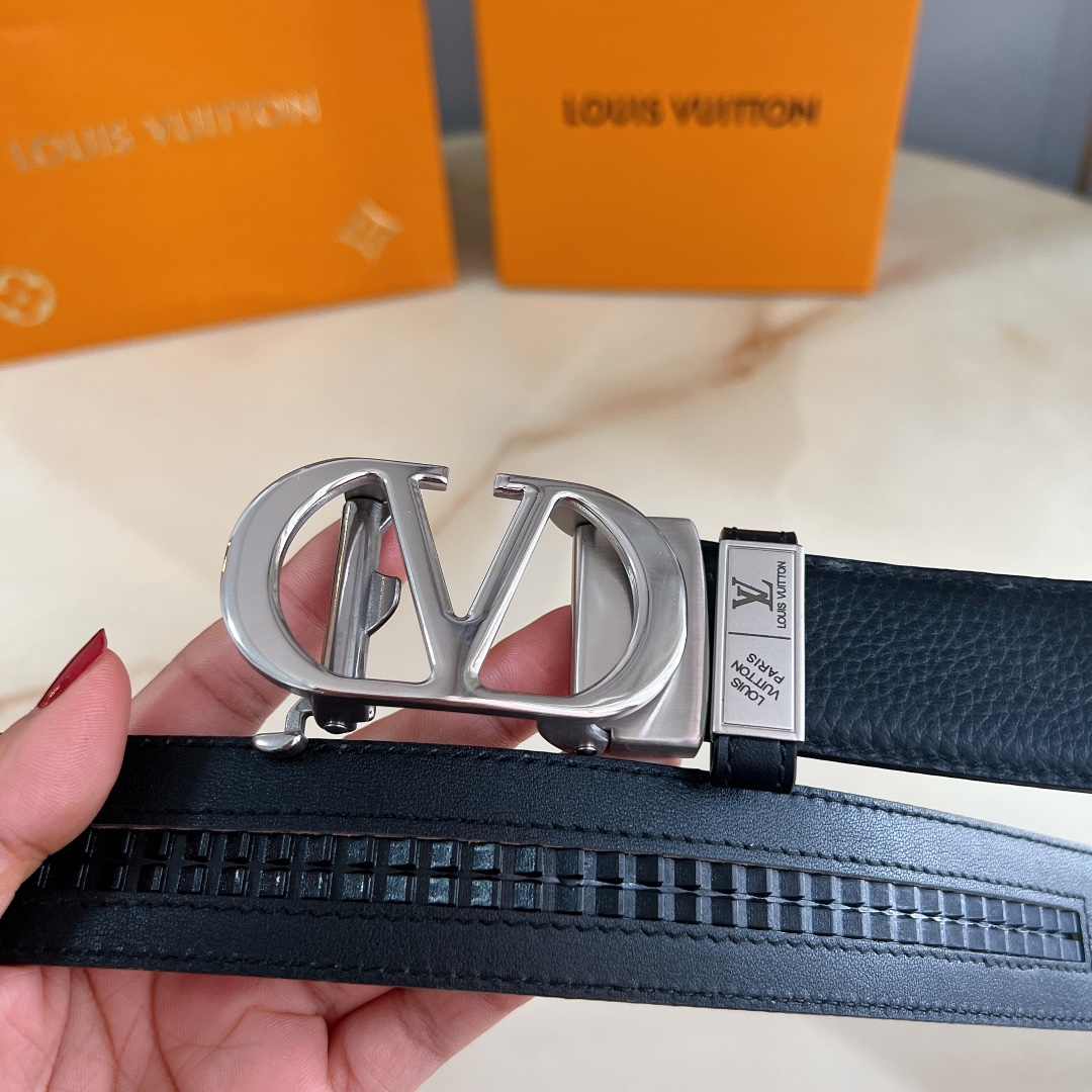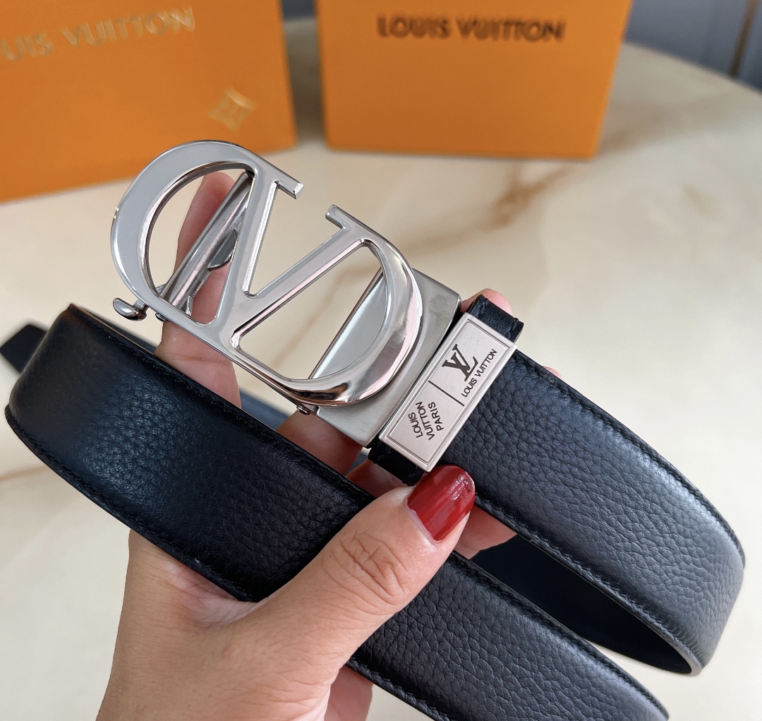 LV automatic belt steel buckle original leather with lychee texture Initiales mm, the belt interprets two classic styles in a double-sided style: Monogram shows the essence of Louis Vuitton’s beauty, and calfskin interprets low-key elegance. An LV monogram buckle completes this versatile design. D