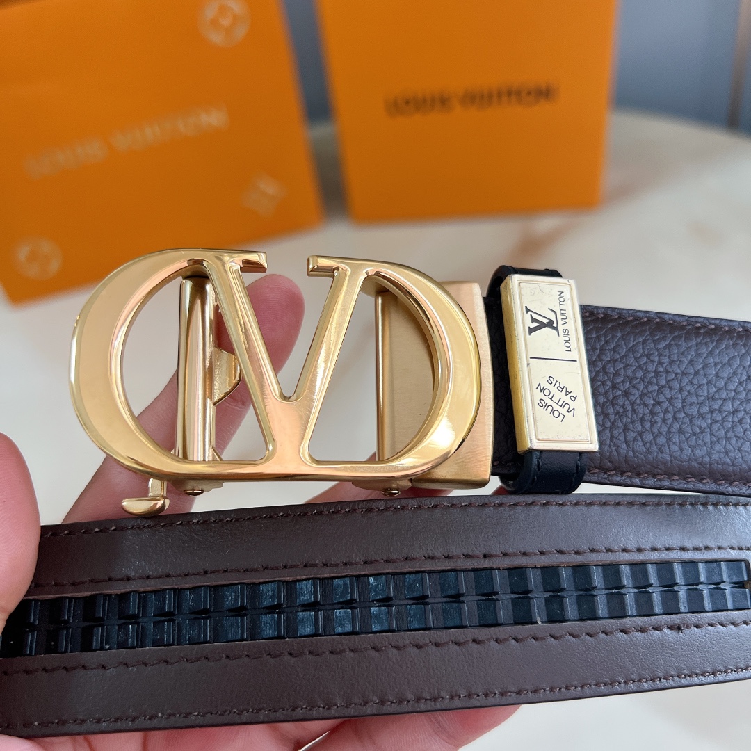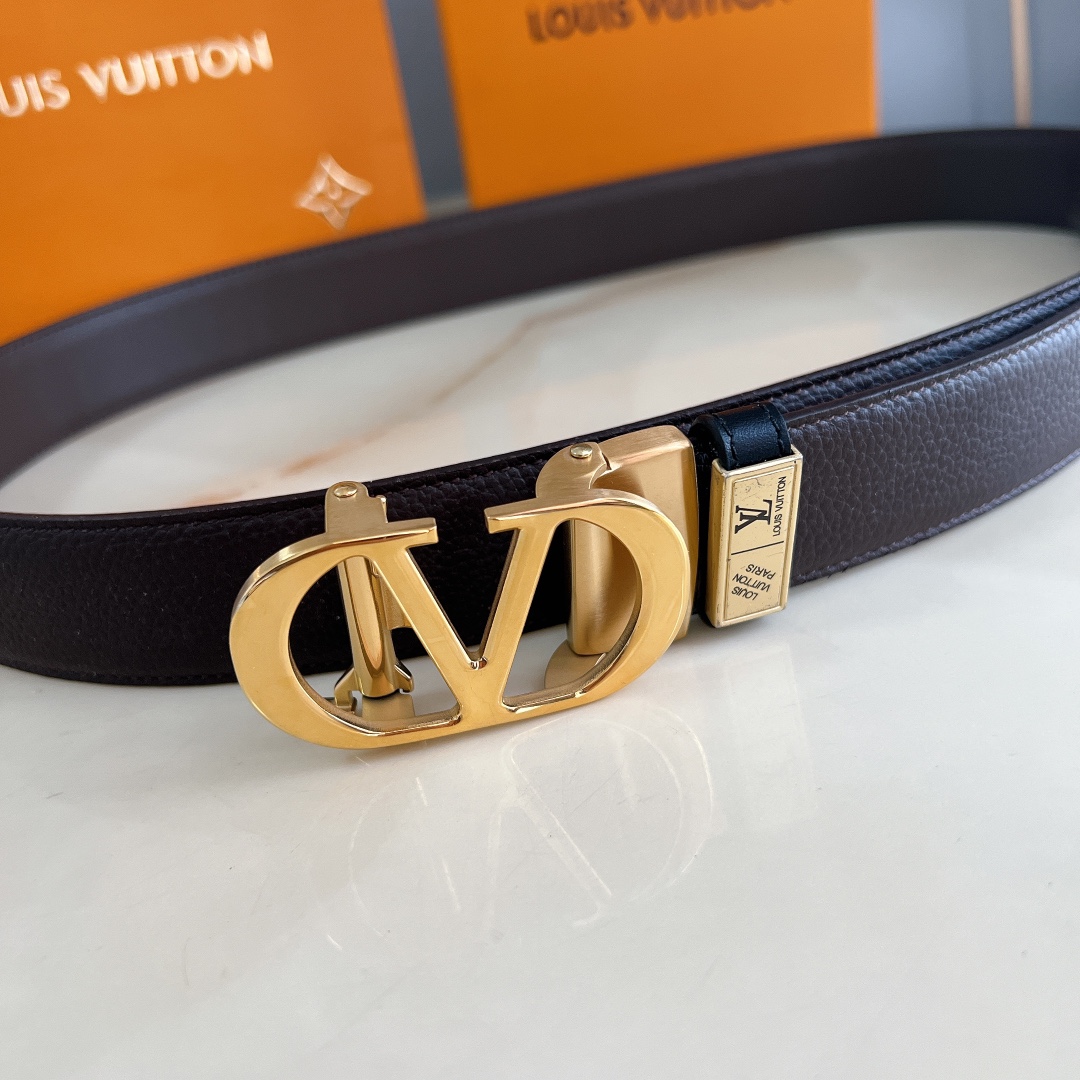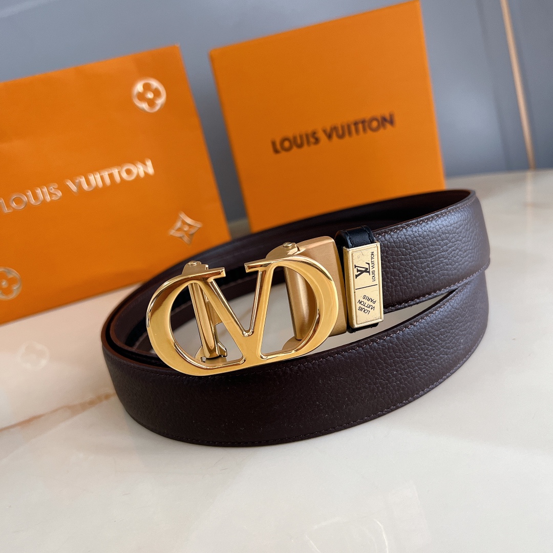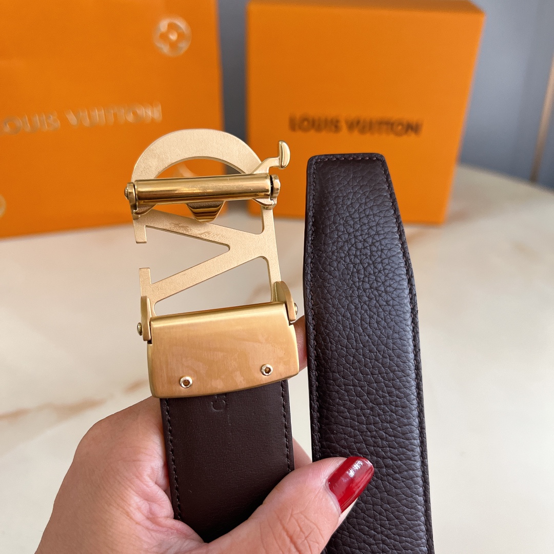 LV automatic belt steel buckle original leather with lychee texture Initiales mm, the belt interprets two classic styles in a double-sided style: Monogram shows the essence of Louis Vuitton’s beauty, and calfskin interprets low-key elegance. An LV monogram buckle completes this versatile design. D