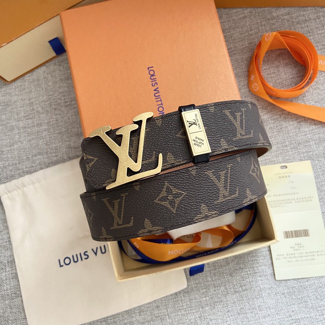 LV Initiales 40mm new English double-layer steel buckle counter belt printed sand bottom double-sided style interprets two classics: Monogram shows the essence of Louis Vuitton’s beauty, and calfskin interprets low-key elegance. An LV monogram buckle completes this versatile design. p