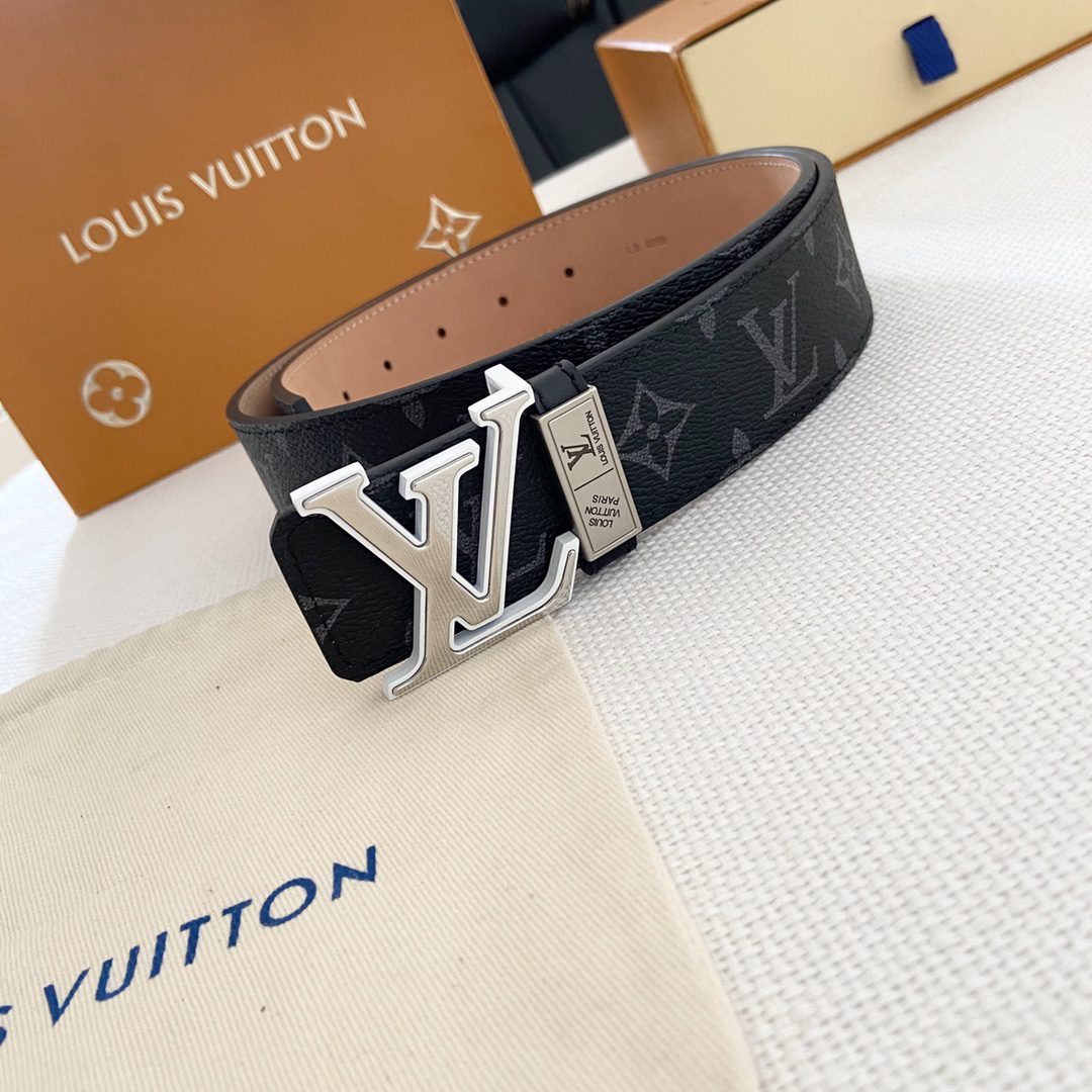 LV Initiales 40mm new English double-layer steel buckle counter belt printed sand bottom double-sided style interprets two classics: Monogram shows the essence of Louis Vuitton’s beauty, and calfskin interprets low-key elegance. An LV monogram buckle completes this versatile design. p