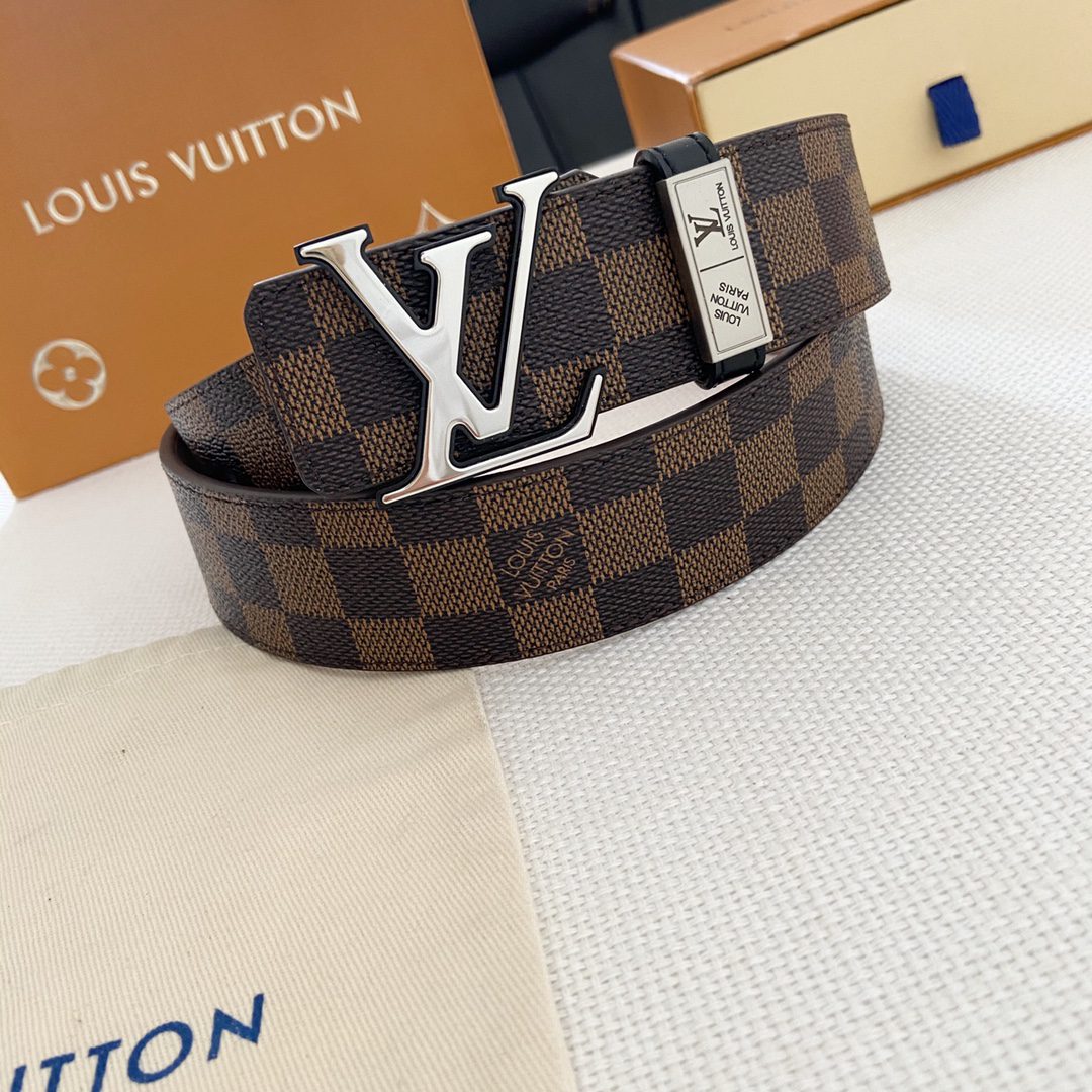 LV Initiales 40mm new English double-layer steel buckle counter belt printed sand bottom double-sided style interprets two classics: Monogram shows the essence of Louis Vuitton’s beauty, and calfskin interprets low-key elegance. An LV monogram buckle completes this versatile design. p