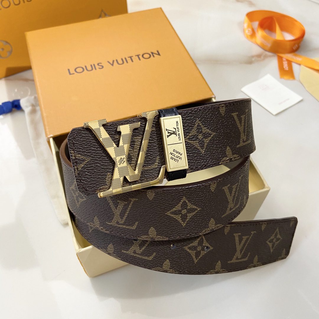 LV Initiales 40mm new English steel buckle counter belt printed sand bottom double-sided style interprets two classics: Monogram shows the essence of Louis Vuitton’s beauty, and calfskin interprets low-key elegance. An LV monogram buckle completes this versatile design. D