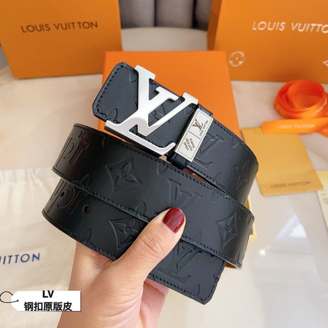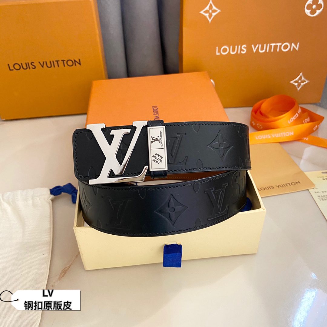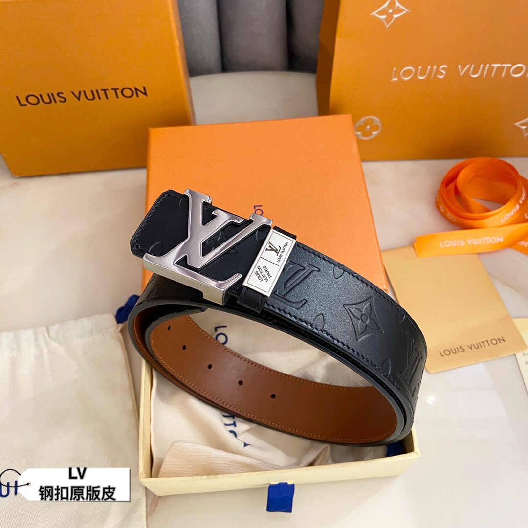 LV Initiales 40 mm new English steel buckle printed double-sided cowhide leather sole counter belt double-sided fashion interprets two classics: Monogram shows the essence of Louis Vuitton’s beauty, and calfskin interprets low-key elegance. An LV monogram buckle completes this versatile design. D