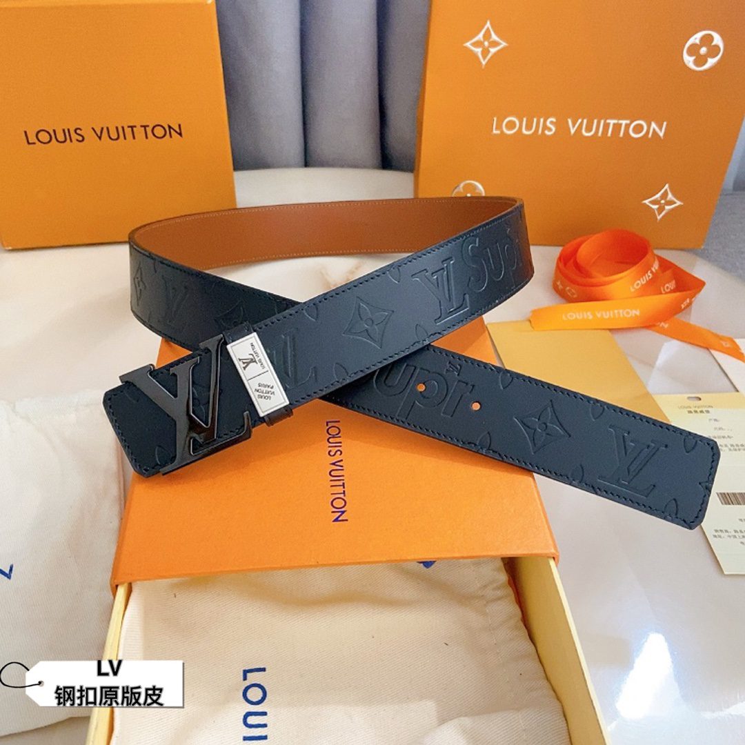 LV Initiales 40 mm new English steel buckle printed double-sided cowhide leather sole counter belt double-sided fashion interprets two classics: Monogram shows the essence of Louis Vuitton’s beauty, and calfskin interprets low-key elegance. An LV monogram buckle completes this versatile design. D