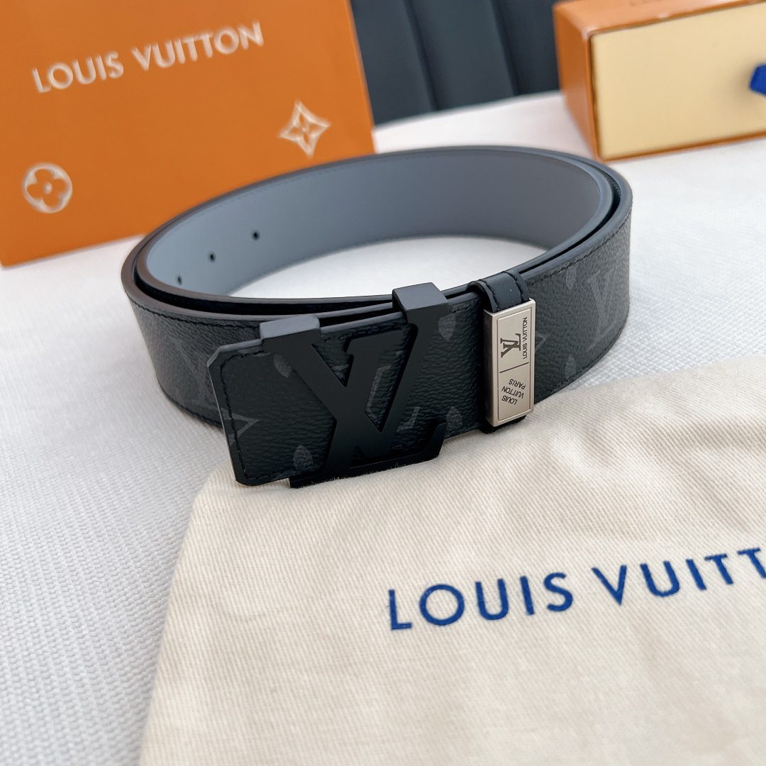 LV Initiales 40mm new English double-layer steel buckle counter belt printed leather sole double-sided style interprets two classics: Monogram shows the essence of Louis Vuitton’s beauty, and calfskin interprets low-key elegance. An LV monogram buckle completes this versatile design. p
