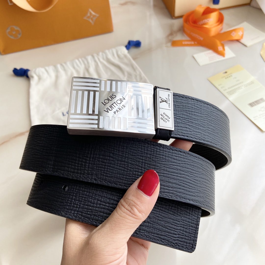 LV Initiales 40mm new English steel buckle counter belt handprint printed sand bottom double-sided style interprets two classic styles: Monogram shows the essence of Louis Vuitton’s beauty, and calfskin interprets low-key elegance. An LV monogram buckle completes this versatile design. D