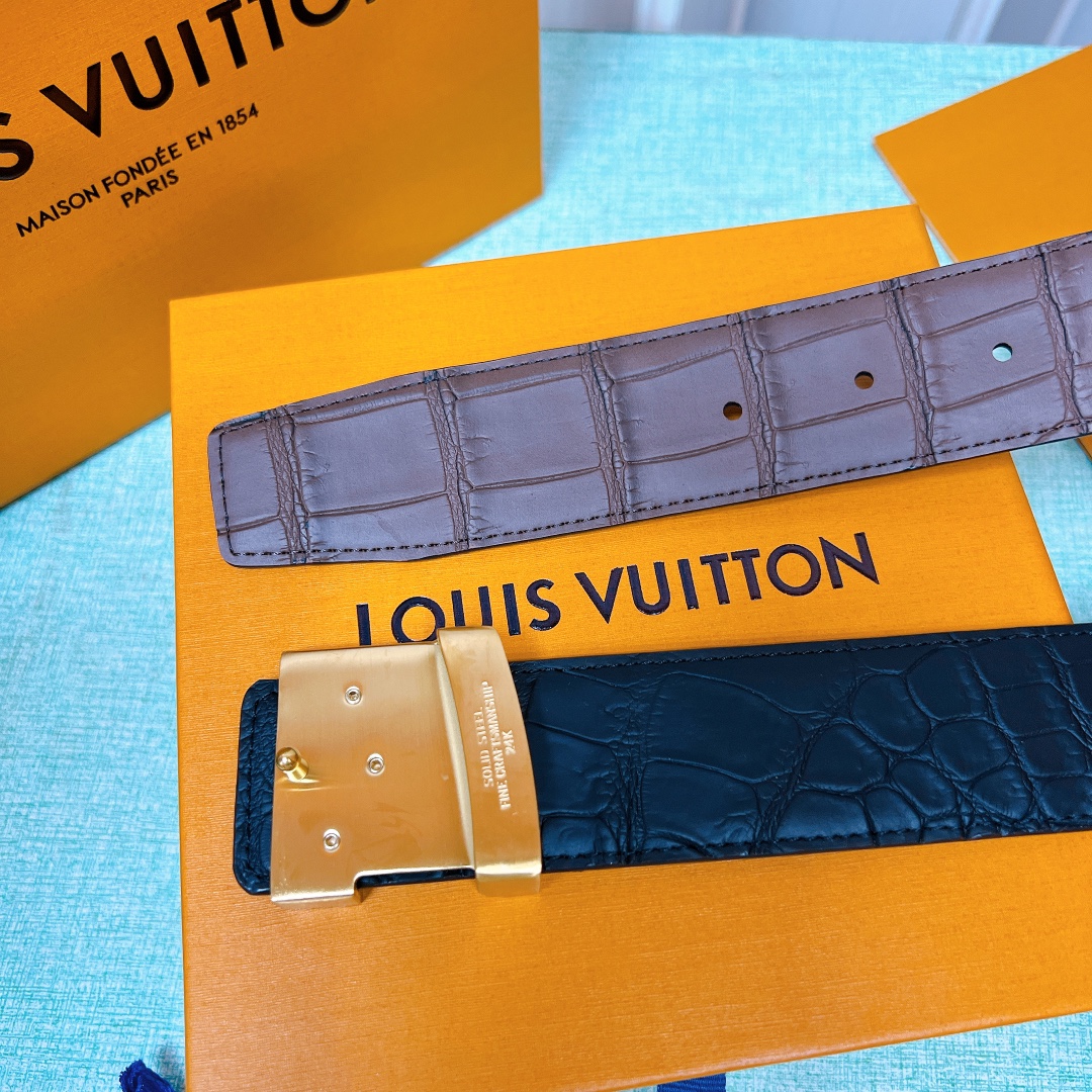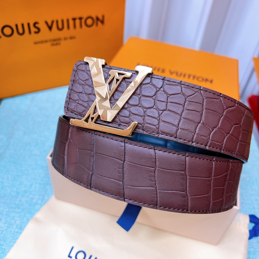 LV Initiales 40mm new hollow steel buckle counter double-sided black coffee crocodile pattern belt interprets two classic styles in a double-sided style: Monogram shows the essence of Louis Vuitton’s beauty, and calfskin interprets low-key elegance. An LV monogram buckle completes this versatile design. D