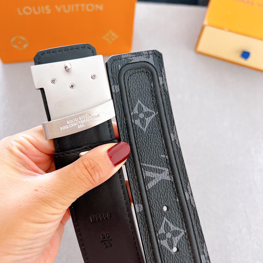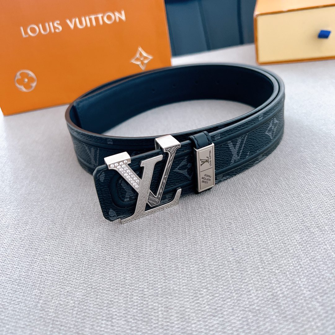 LV Initiales 40mm Shark Pattern New English Double Layer Diamond-encrusted Steel Buckle Counter Belt Printed Double-sided Fashion Interpretation of Two Classic Styles: Monogram shows the essence of Louis Vuitton’s beauty, and calfskin interprets low-key elegance. An LV monogram buckle completes this versatile design. D