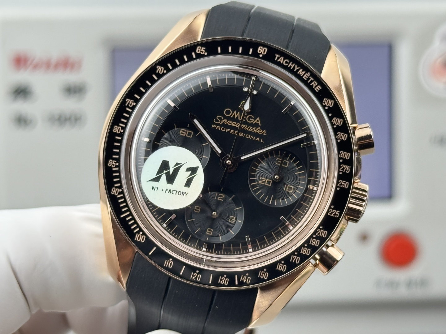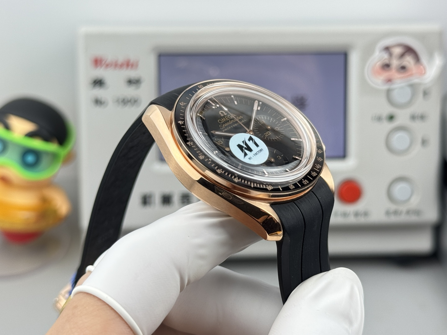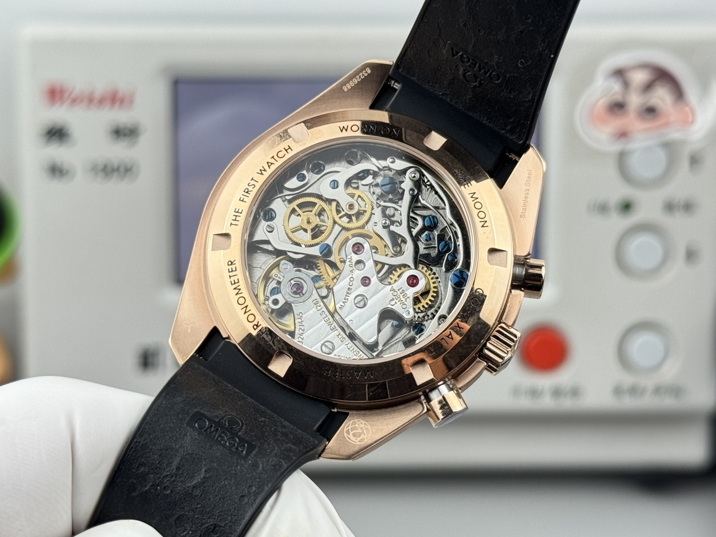 The dot of N is located above the number) mark. Polished with a double bevel design and engraved with “THE FIRST WATCH WORN ON THE MOON” and “CO-AXIAL MASTER CHRONOMETER”. Through the flat sapphire glass case back, you can appreciate the beauty of the 61 Master Chronometer movement. “N1 quality, must be a high-quality product”
