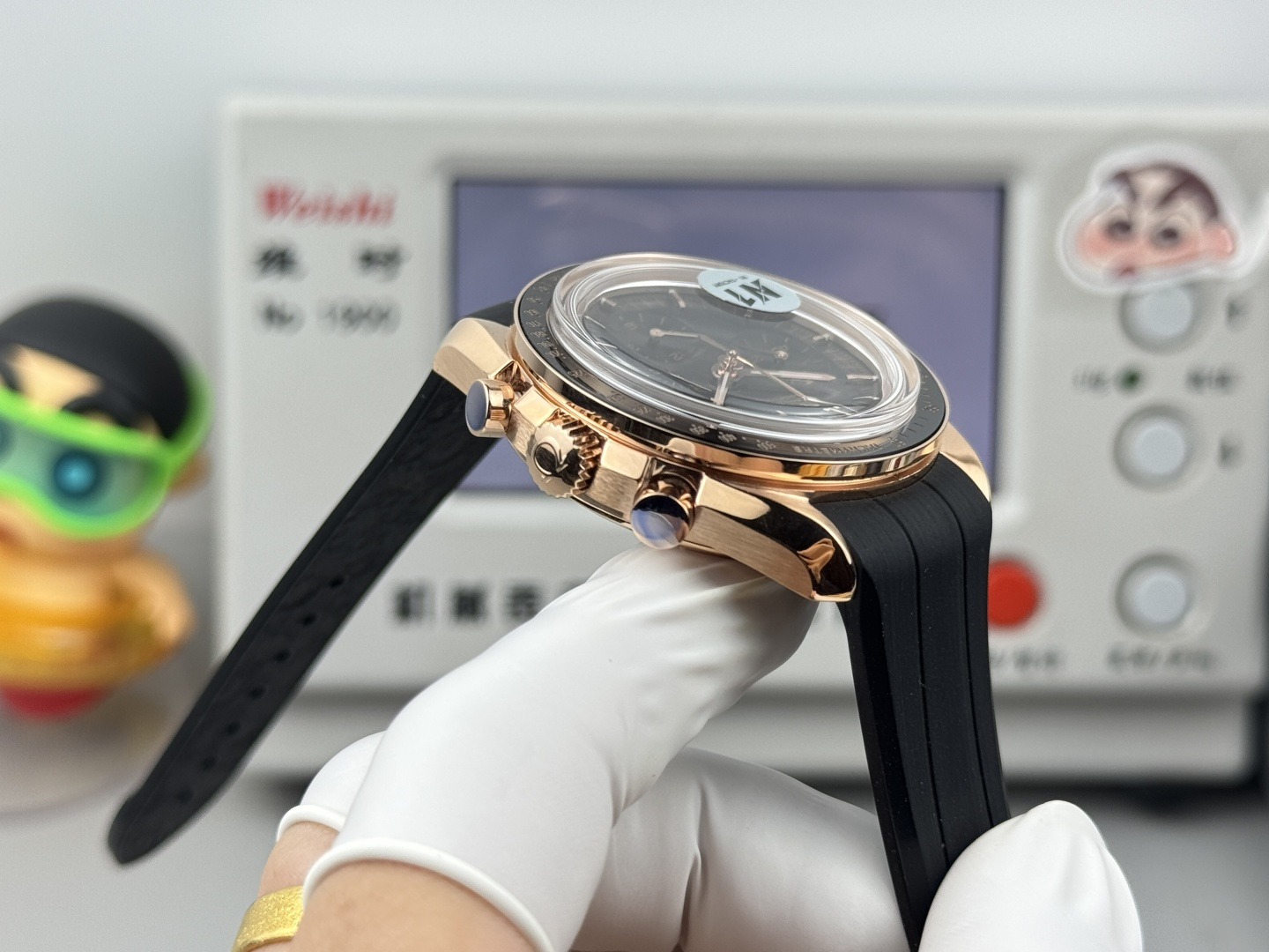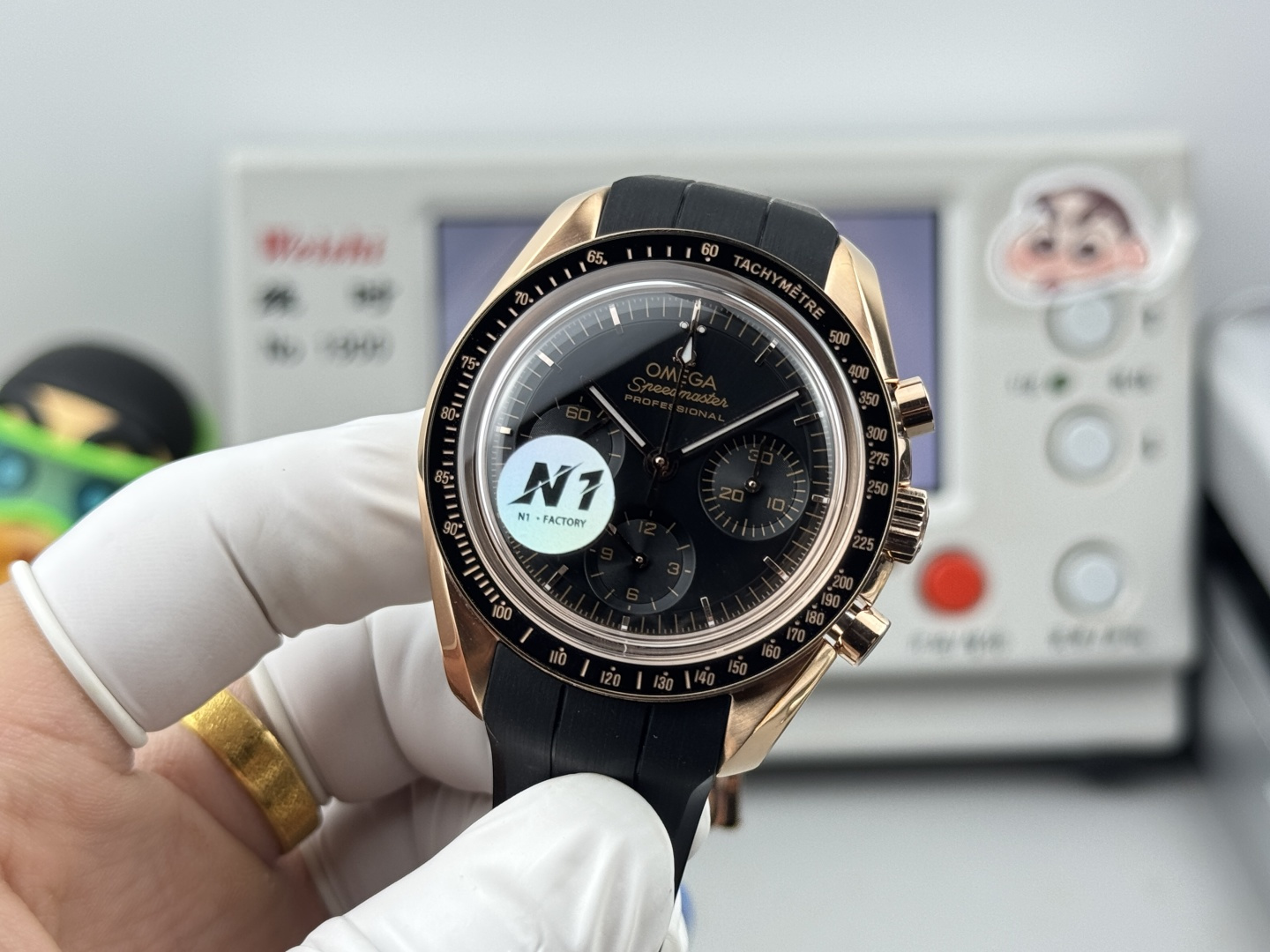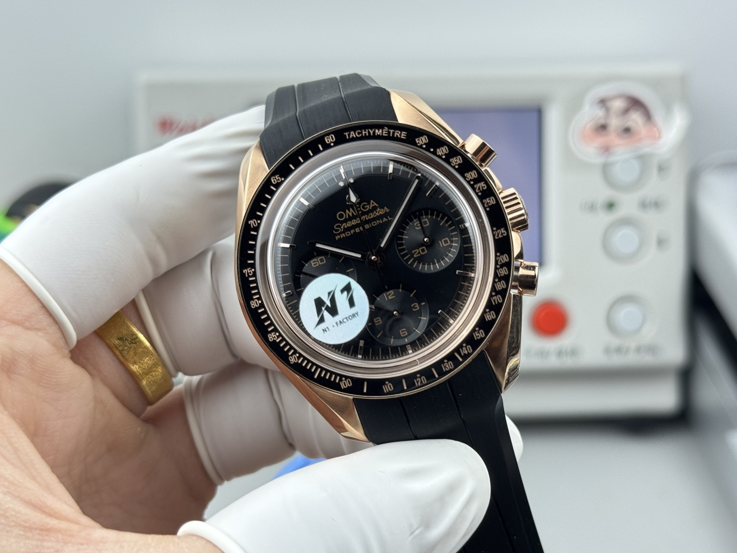The dot of N is located above the number) mark. Polished with a double bevel design and engraved with “THE FIRST WATCH WORN ON THE MOON” and “CO-AXIAL MASTER CHRONOMETER”. Through the flat sapphire glass case back, you can appreciate the beauty of the 61 Master Chronometer movement. “N1 quality, must be a high-quality product”