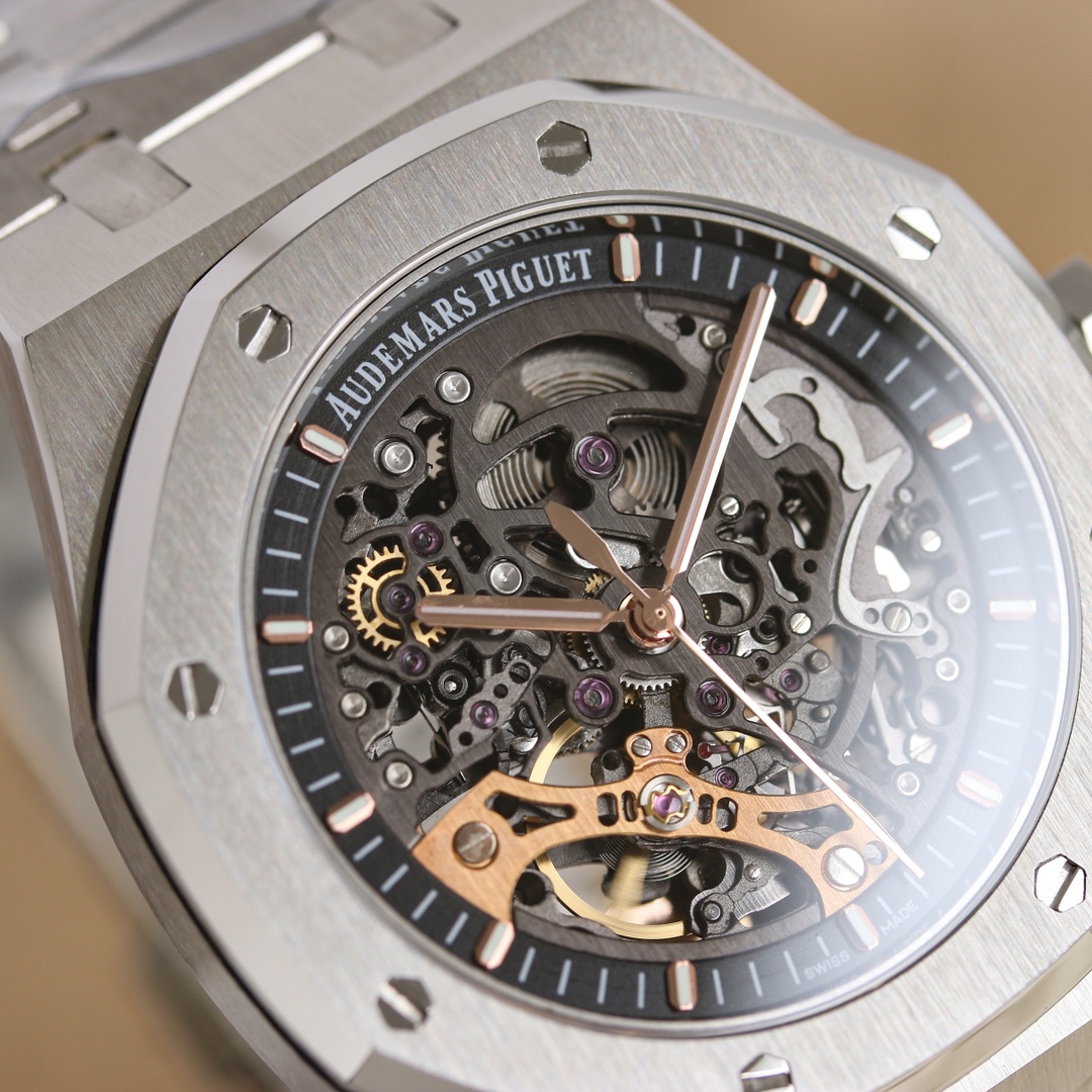 New Audemars Piguet Royal Oak Offshore 7ST.OO.ST.0 integrated movement, 4.9mm dark gray Dial shape: Round Dial material: Skeleton dial, with rose gold fluorescent three-dimensional hour markers and Royal Oak hands Mirror material: Anti-reflective sapphire crystal glass Crown material: Stainless steel, screw-in crown Back see-through: back see-through, anti-glare sapphire glass mirror