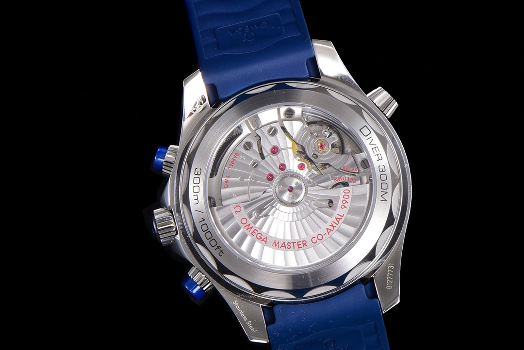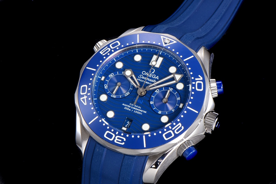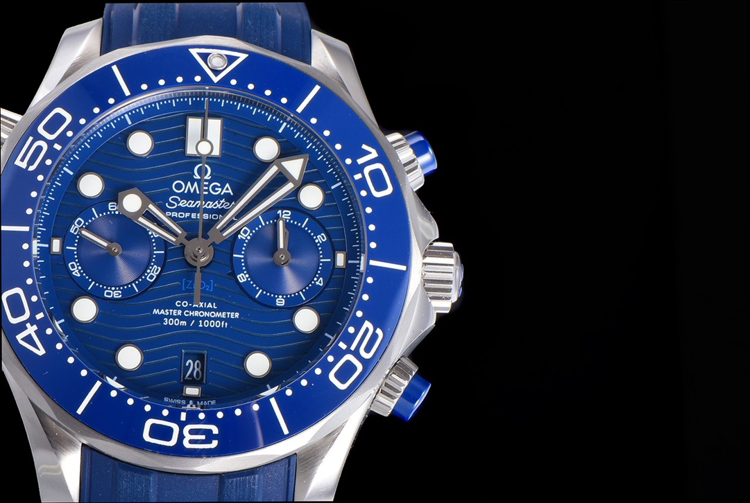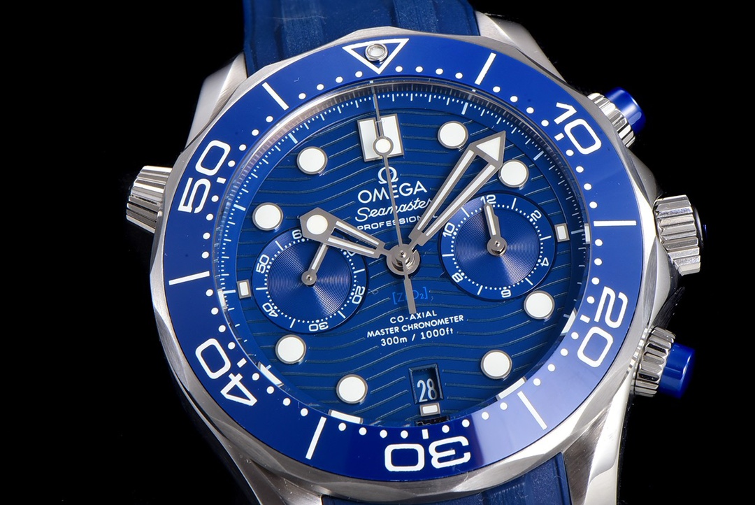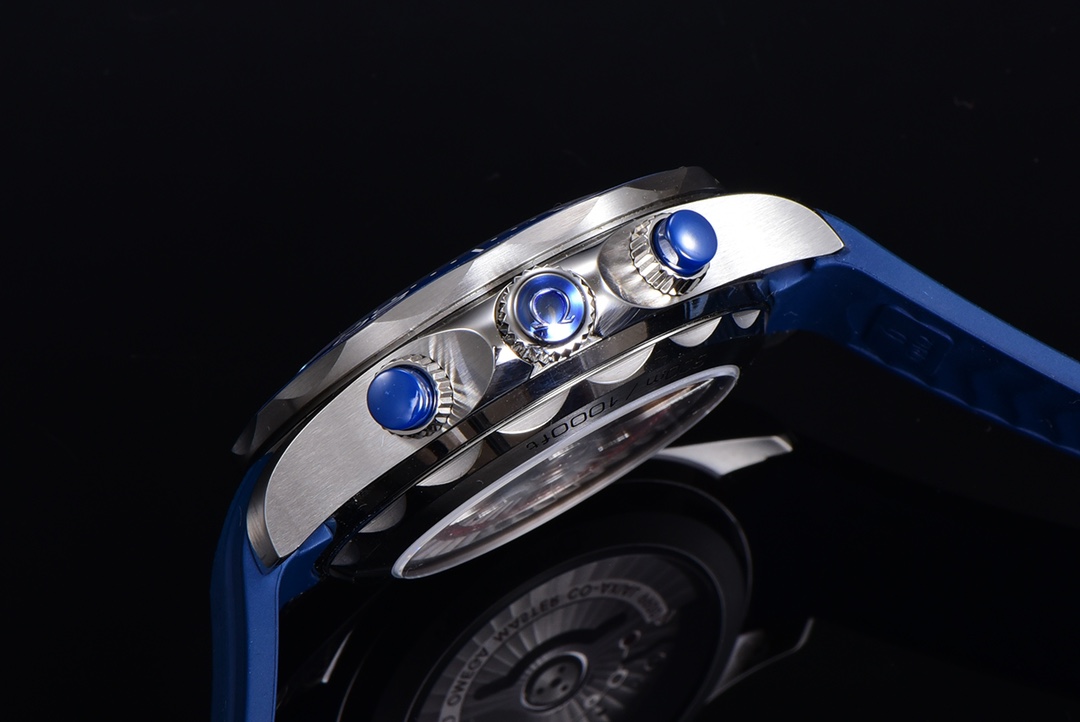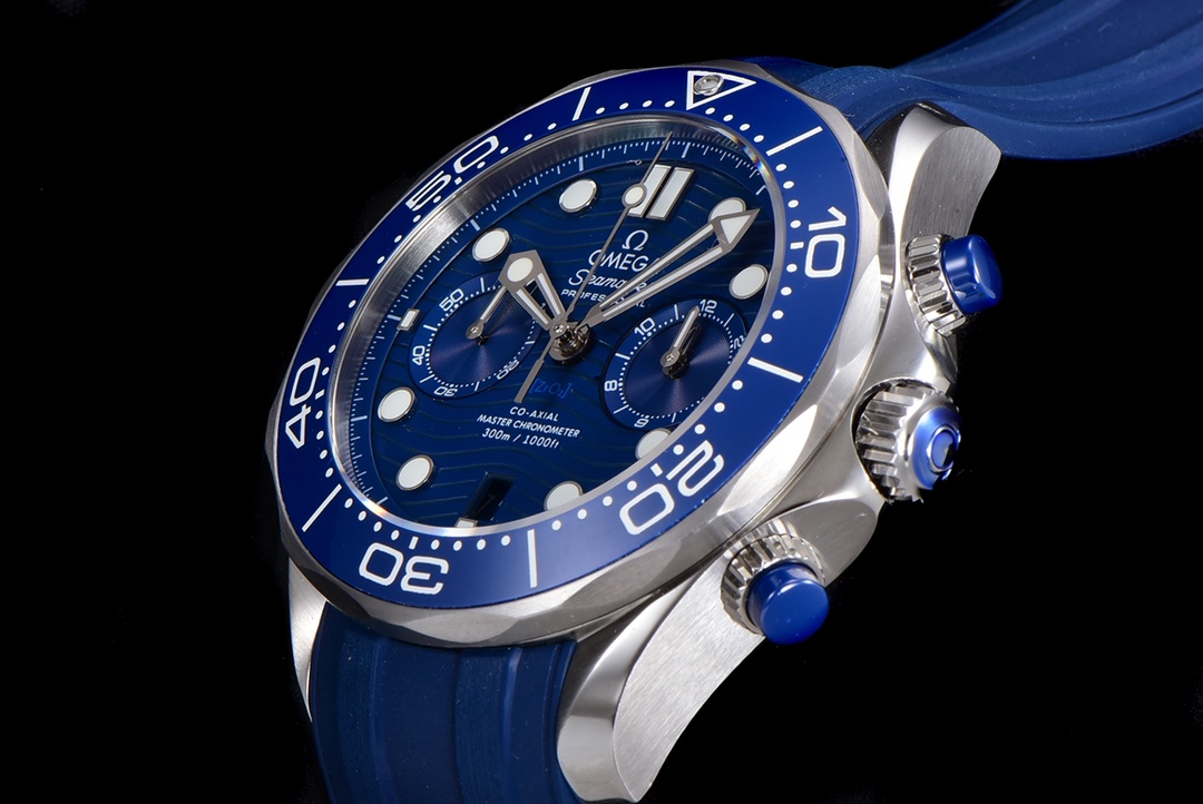 OM New Product Summer Sneak Extreme Experience Omega’s new Seamaster 0-meter 44mm chronograph watch, OM’s original minute counter [0-meter porcelain plate has obvious lines, and the glossy surface of the plate is translucent [2] The smooth and delicate lines of the case are consistent with the original version without cracks, the original tapered exhaust valve, and the sound of the ring turning is crisp and smooth. [The functions of the modified CAL.9900 movement are consistent with the original version