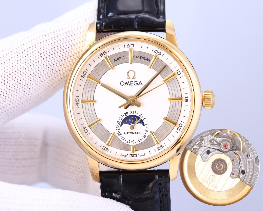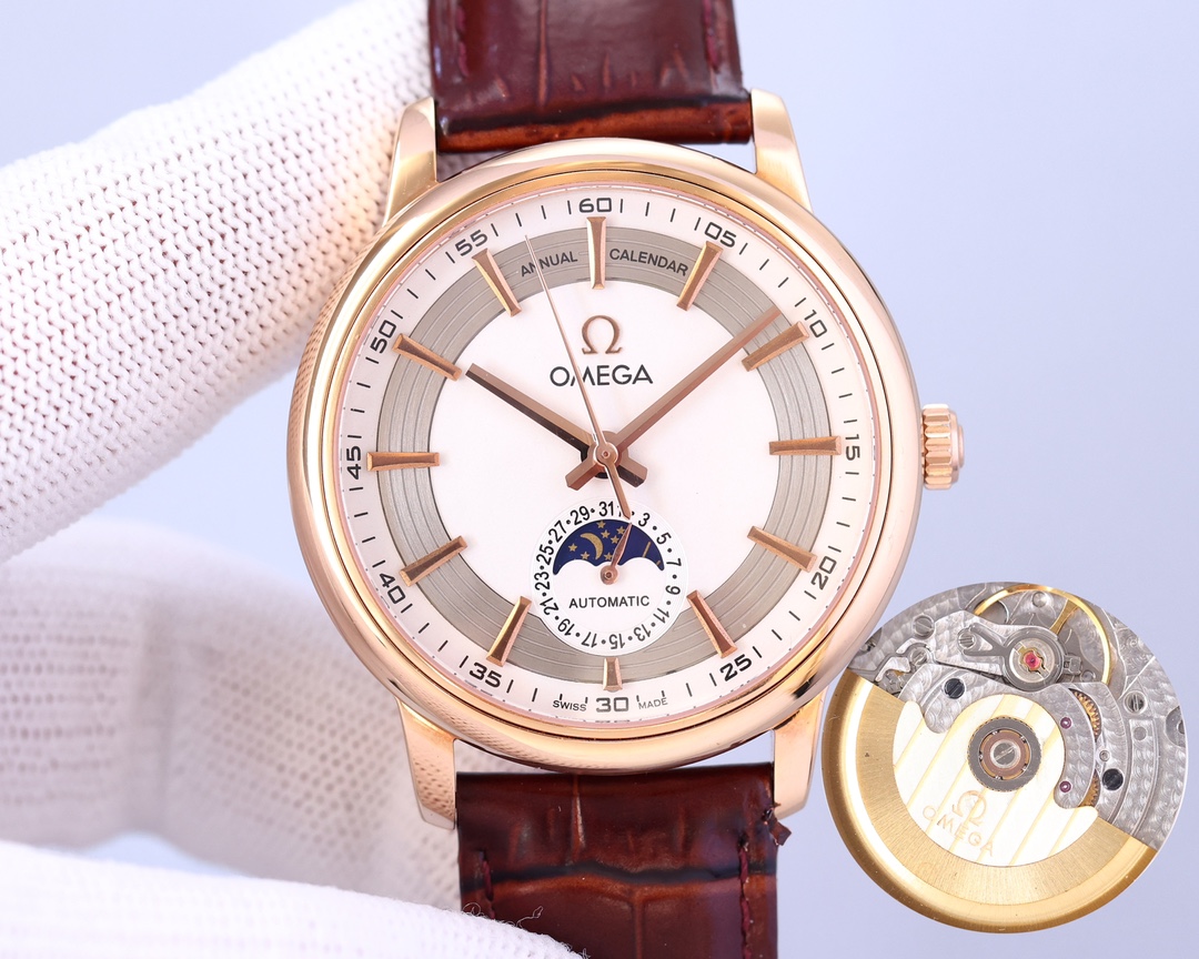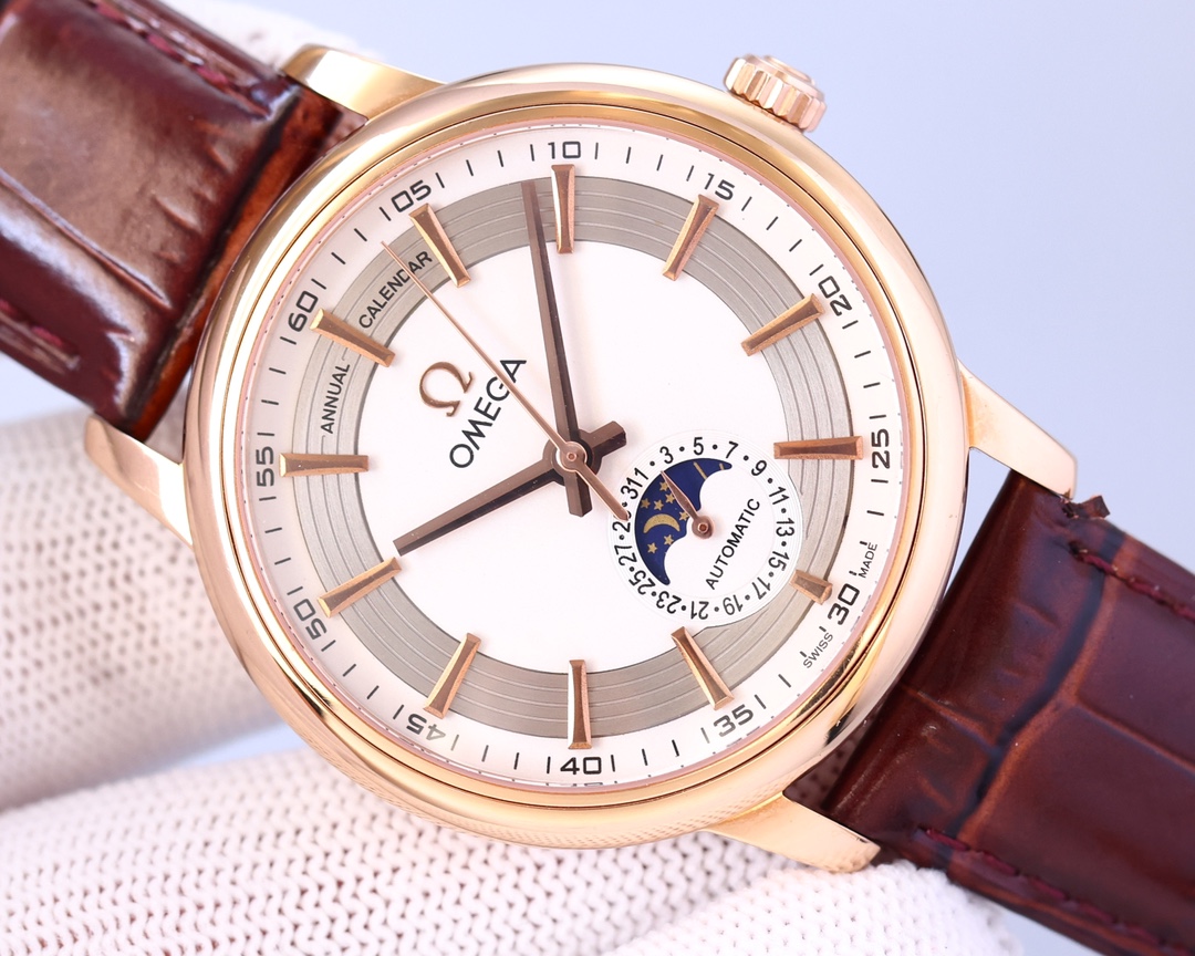Omega classic moon phase. The Mingdian watch moon phase series adheres to Omega’s consistent tradition and more beautifully combines the 6-digit calendar with the sun and moon astrology that is popular among watch lovers. Whether it is the classic and timeless dial design or the cool polygonal lines carved from stainless steel or rose gold, it is no exception. It also uses Swiss ETA2824-*. Sapphire glass. Italian calfskin. Original pin buckles are top-quality products.