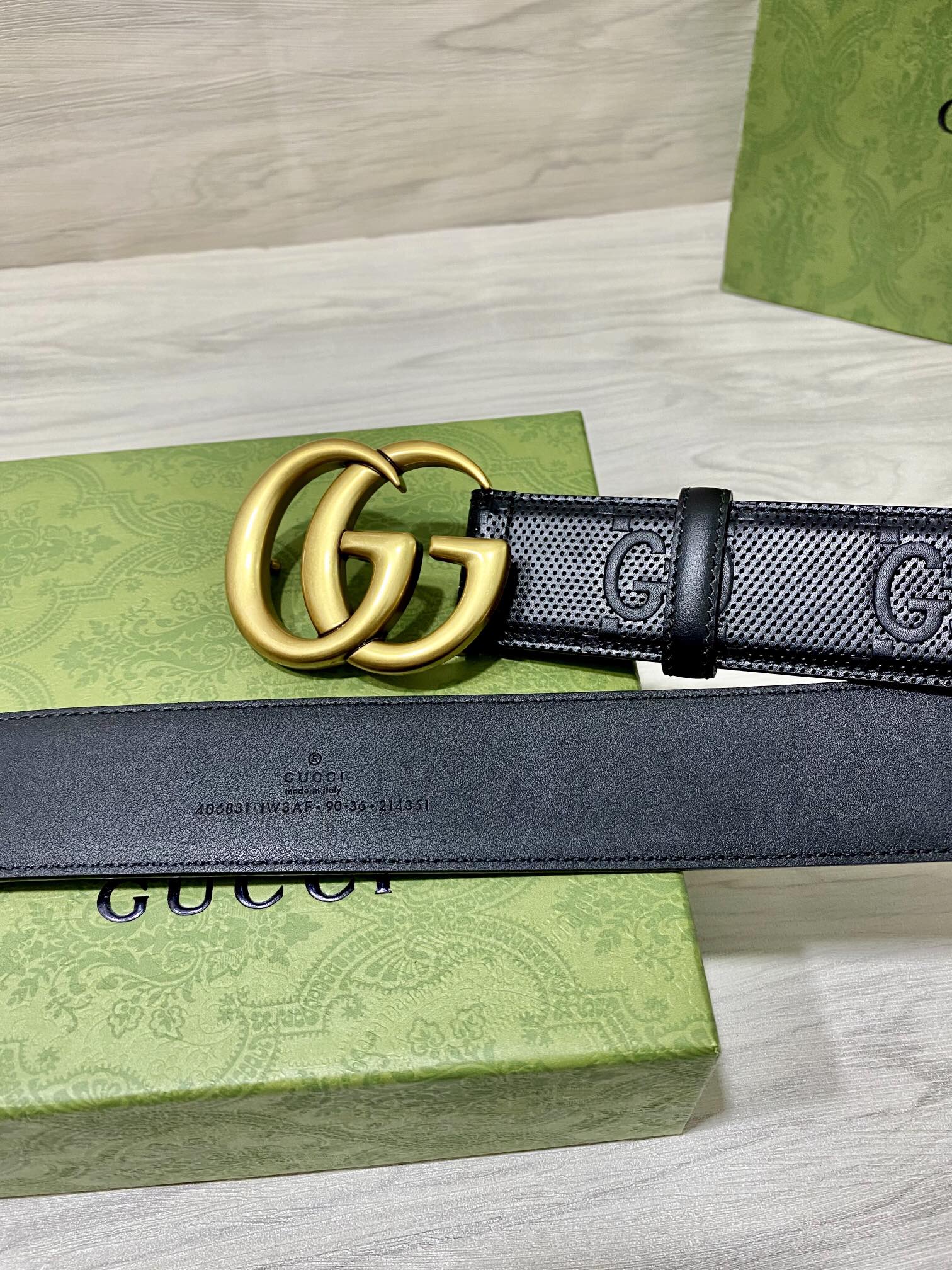 Belt Original 40mm belt made of double-sided imported first-layer cowhide, with needle pattern embossed large G on one side and plain grain on the other. Original factory order $129.00 Original price was: $129.00.$89.00Current price is: $89.00.