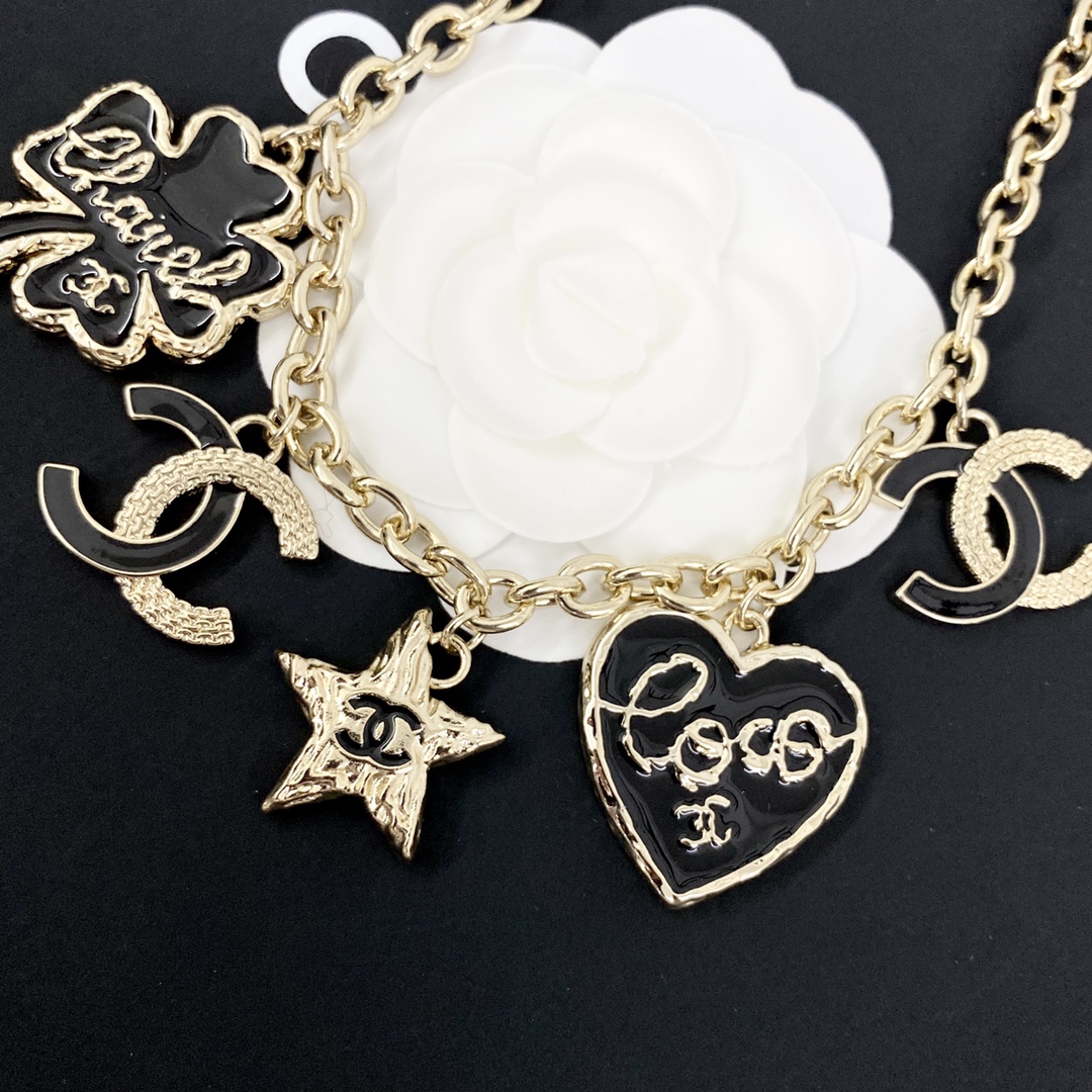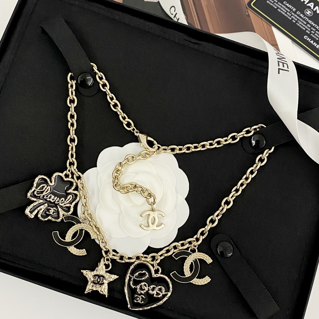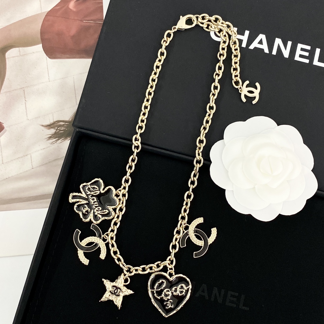 p Chanel necklace’s best-selling model has exploded into the new zpCHAN 24 enamel four-leaf clover love multi-element necklace 🤑 Classic enamel black gold color, playful love and four-leaf clover multi-element design! 🤠The finishing touch of the five-pointed star design on the chain gives the overall style a sweet and cool feel! Retro and modern, super stylish~