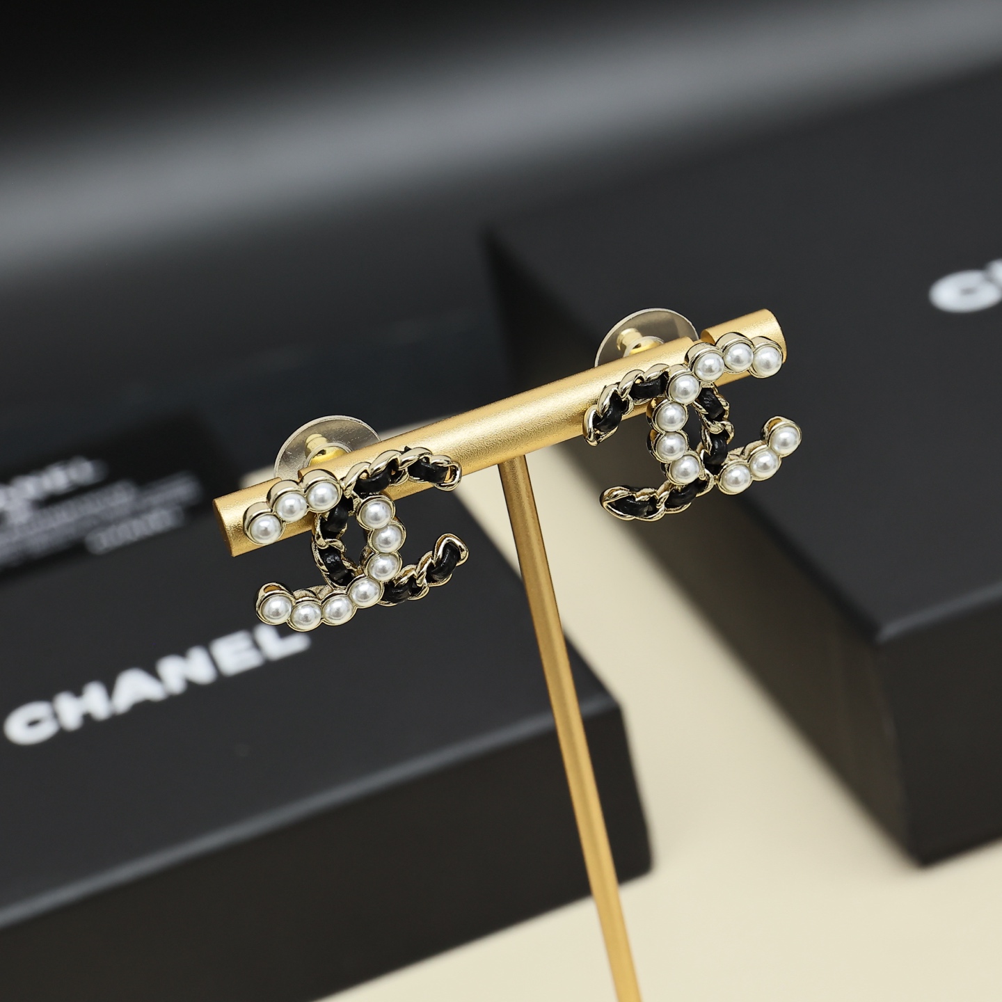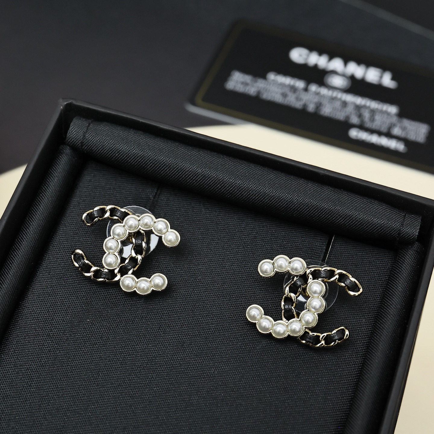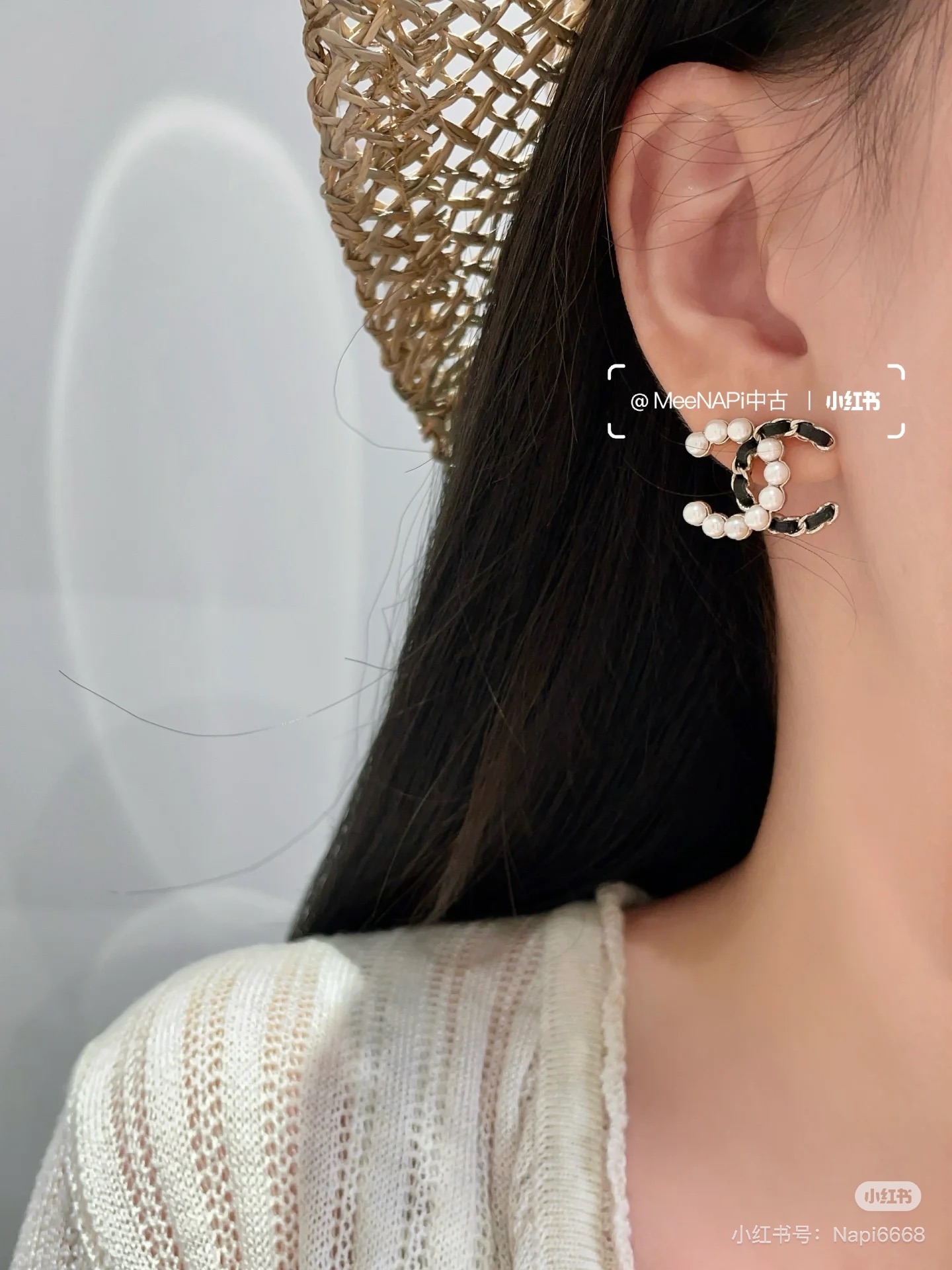 p45 Chanel 25K Pearl Double C Stud Earrings, Classic Double C Logo + Black Leather Chain, Elegant and Sophisticated. The white pearls are spliced with metal materials, making it look smaller when worn and full of temperament. The pearls symbolize gentleness and intellectuality, and the leather chain adds a modern feel. It is suitable for commuting or formal occasions. Pair it with a coat and sweater in autumn and winter to instantly enhance the sense of sophistication. It is a classic style among Chanel accessories and a must-have for fashionistas.