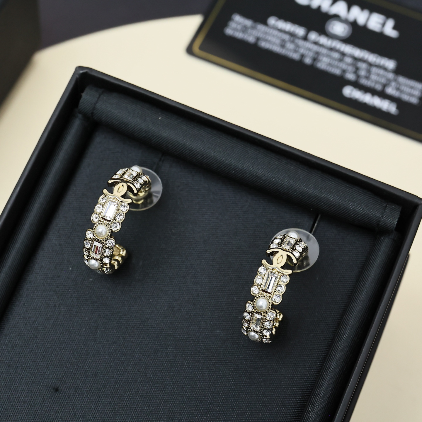 p48 Chanel 0th anniversary CC half-circle square diamond stud earrings are made of gold-plated metal and inlaid with imitation crystals and pearls, full of retro luxury. The half-circle design fits the auricle, making it comfortable to wear and elegant. Embellished with imitation crystals and pearls, it is full of layers and can be easily used for daily commuting or formal occasions, instantly enhancing the sophistication of the overall look.