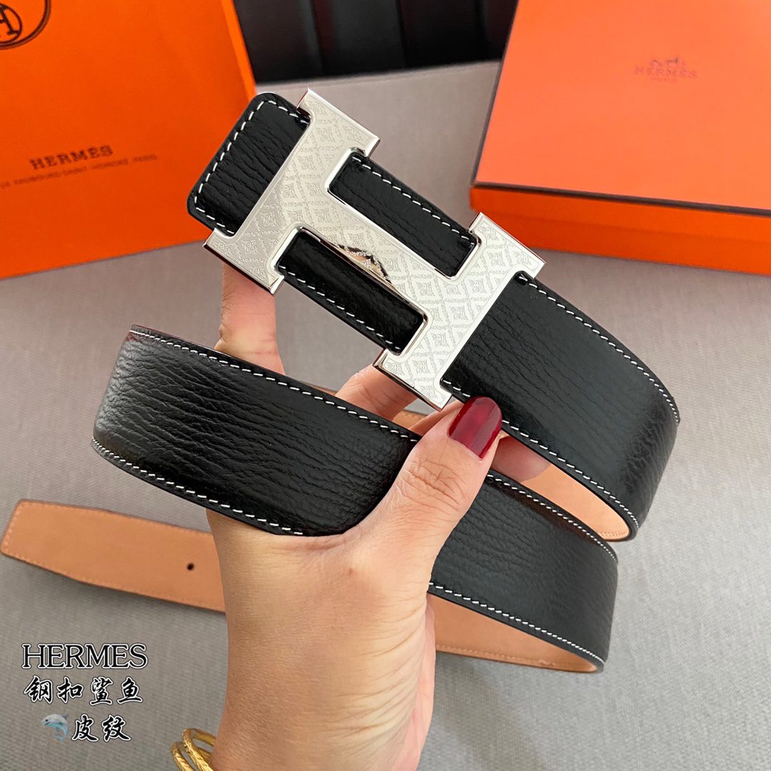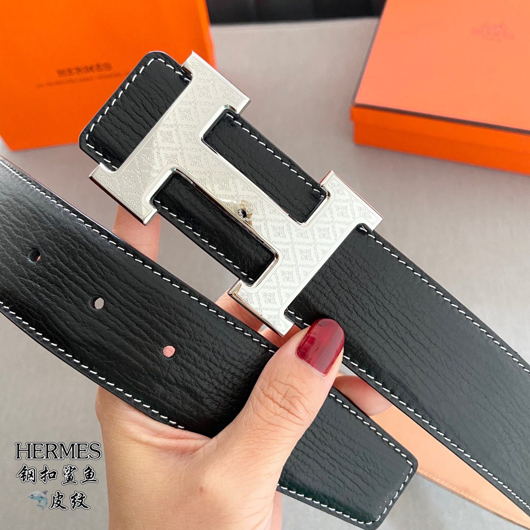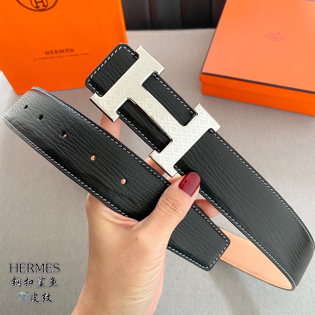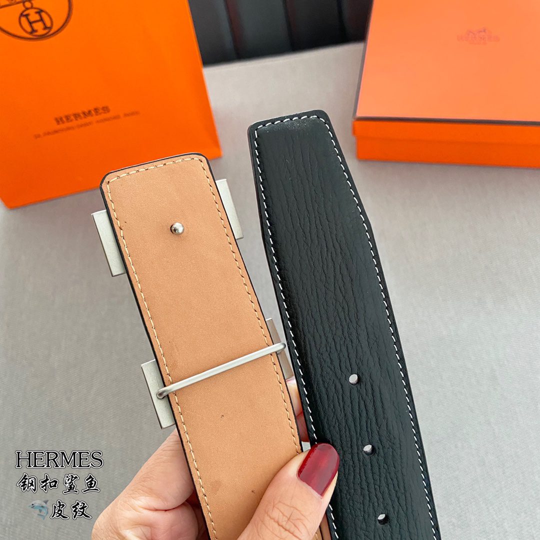 Home Belt Belt p5 Hermes (Hermes) cm double-sided original leather, steel buckle shark 🦈 pattern