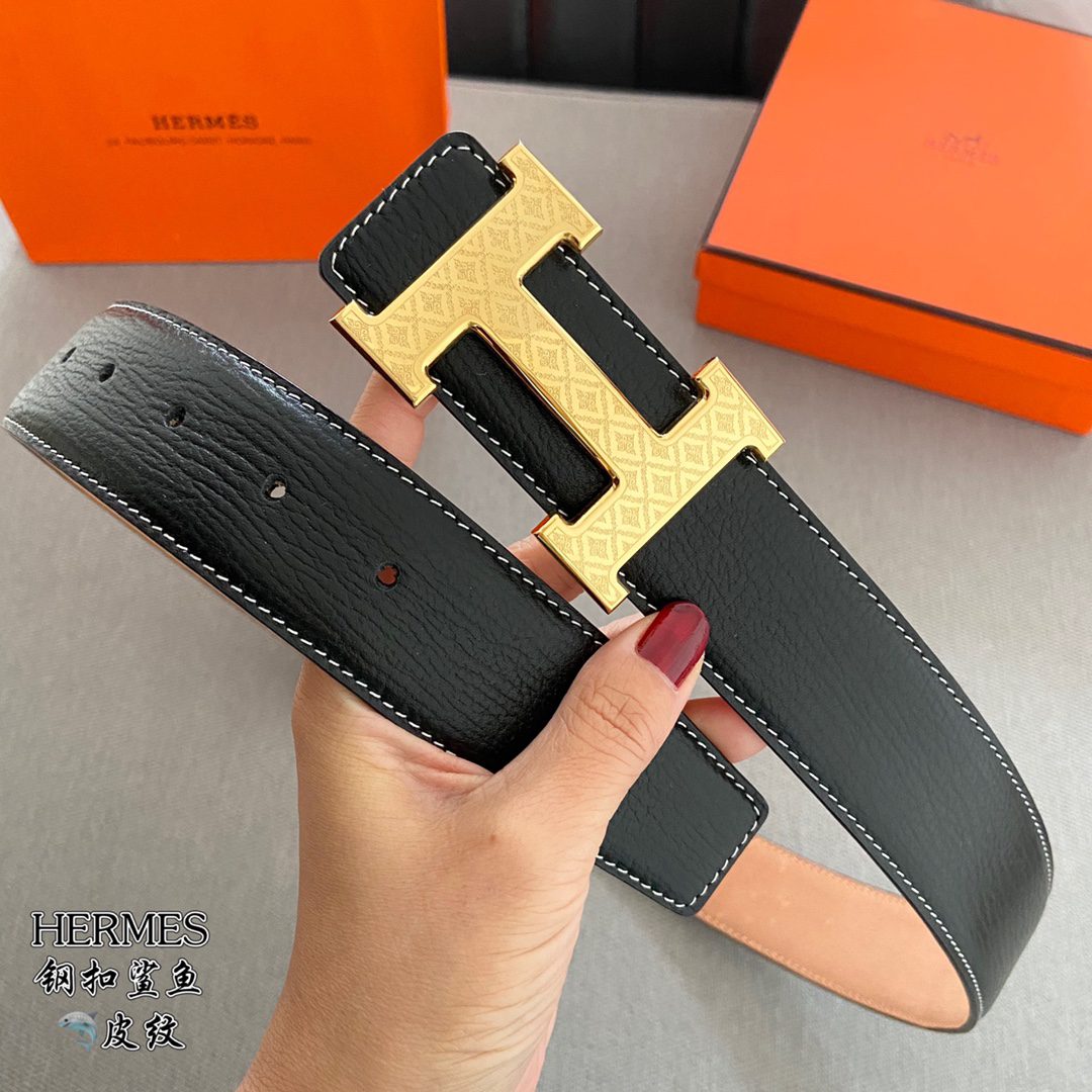 Home Belt Belt p5 Hermes (Hermes) cm double-sided original leather, steel buckle shark 🦈 pattern