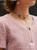 p60 Chanel 25k sunflower bead necklace classic double C logo + black star diamond background, surrounded by super sparkling diamonds! The chain is gold-plated metal, with pink crystal beads, black agate beads and pearls, elegant and luxurious. The length is moderate and can be easily worn in daily or formal occasions to enhance your temperament.