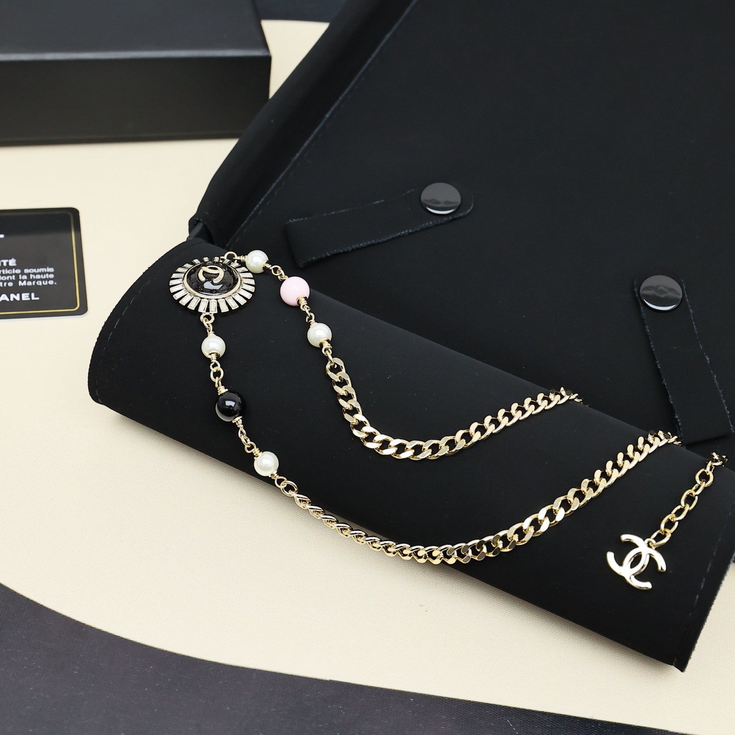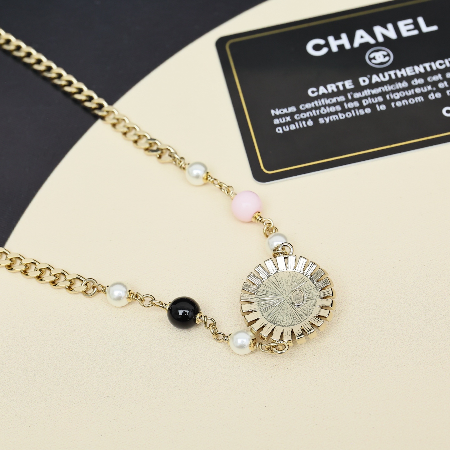 p60 Chanel 25k sunflower bead necklace classic double C logo + black star diamond background, surrounded by super sparkling diamonds! The chain is gold-plated metal, with pink crystal beads, black agate beads and pearls, elegant and luxurious. The length is moderate and can be easily worn in daily or formal occasions to enhance your temperament.