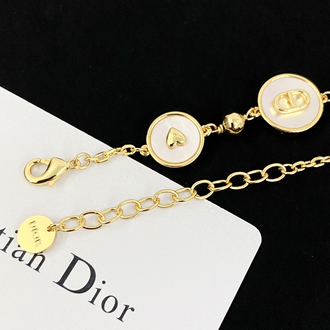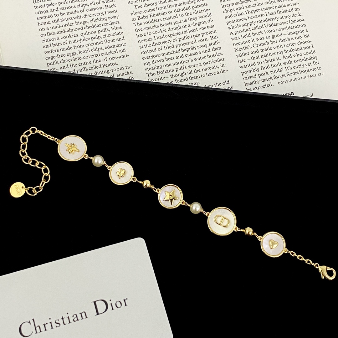 p75DIOR bracelet hot-selling model is new🤑Dior white mother-of-pearl round brand pearl multi-element bracelet retro gold chain strung with white mother-of-pearl round card, superimposed with fashion elements, bee five-pointed star️lucky four-leaf clover golden little heart🧡CD letters and other elements🤒fritillary exudes soft brilliance ~ diverse styles, suitable for different wearing styles, unlocking a variety of fashionable looks