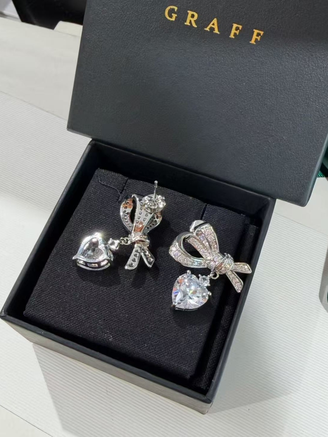 p85 Seiko High Edition Imported 5A High Carbon Diamond Graff Full Diamond Bow Love Earrings are all available in stock. They match the skin tone and are fair and tender. They are extremely versatile and suitable for any occasion. Sister gatherings, giving you a lot of face.