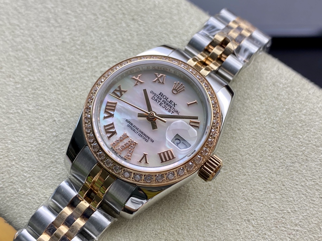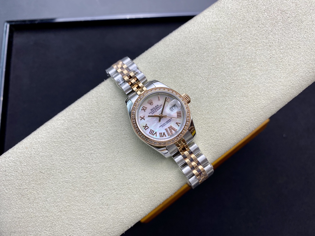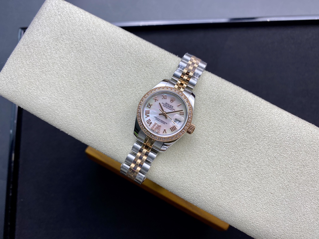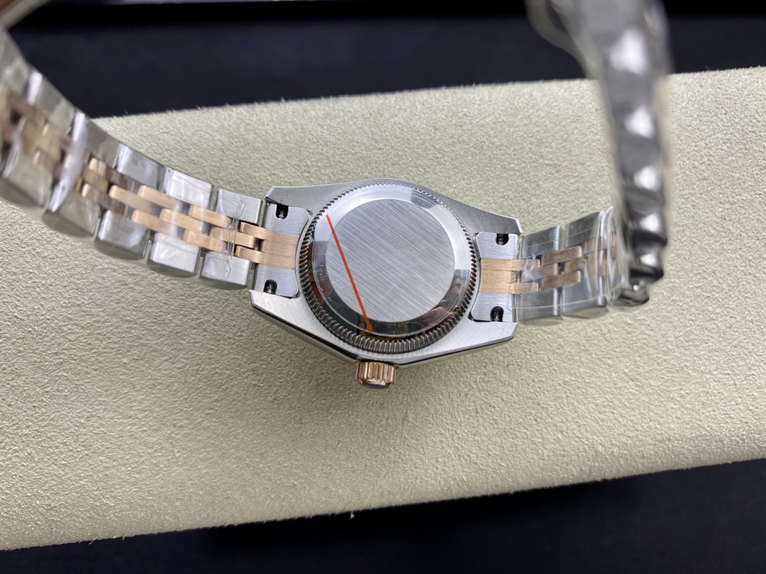 Produced by WF, Women’s Datejust 28mm Datejust 279009 ①: The Oyster case of the Women’s Datejust is a model of solid elegance and perfect proportions. Using the 3671 movement, the performance is extremely stable. Its shock resistance and geometric structure allow the movement to maintain regular operation in any position. ③: The triangular grooved bottom cover is tightened with special tools to completely seal the watch case. The winding crown adopts a double lock double waterproof system and is firmly screwed to the watch case, making it more waterproof. ④: The mirror is made of scratch-resistant blue crystal, and a small window convex lens is installed at 3 o’clock for easy reading of the date. The waterproof Oyster case of the women’s Datejust provides the best protection for the high-precision movement. ⑤: The new hidden connection method under the watch strap and outer ring ensures a seamless visual effect between the strap and the watch case. The redesigned commemorative strap features a new generation concealed crown buckle, opening with an articulated Rolex crown logo. The Oyster strap style is equipped with a folding Oyster buckle. The Rolex S classic women’s watch has always been synonymous with elegant style and accurate timepieces. It condenses the elegance and unique functions of the Datejust into a small and exquisite case, which is more suitable for women’s slender wrists.
