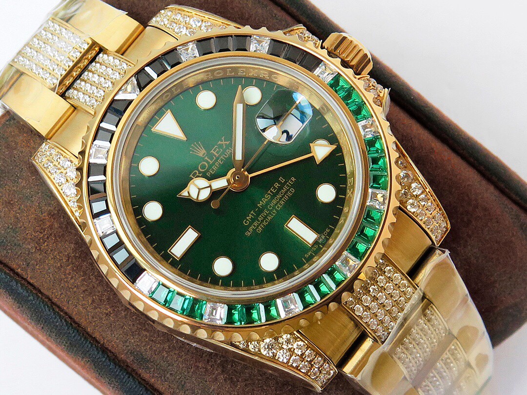 ROF’s luxury masterpiece, a customized version of the Rolex GMT Master II set with diamonds on the back! It is the best choice for luxury, sparkle and classic trend! [Case] ​​Watch size 40mm. Every diamond and colored gem comes from Austria (the origin of Swarovski) and undergoes strict screening to ensure uniform color, size and fire, and is carefully set by ROF jewelry setters. [Movement] It adopts the 2836GMT automatic winding movement widely used in the replica industry. The king of ROF cost-effectiveness is here, please appreciate it from all watch friends.