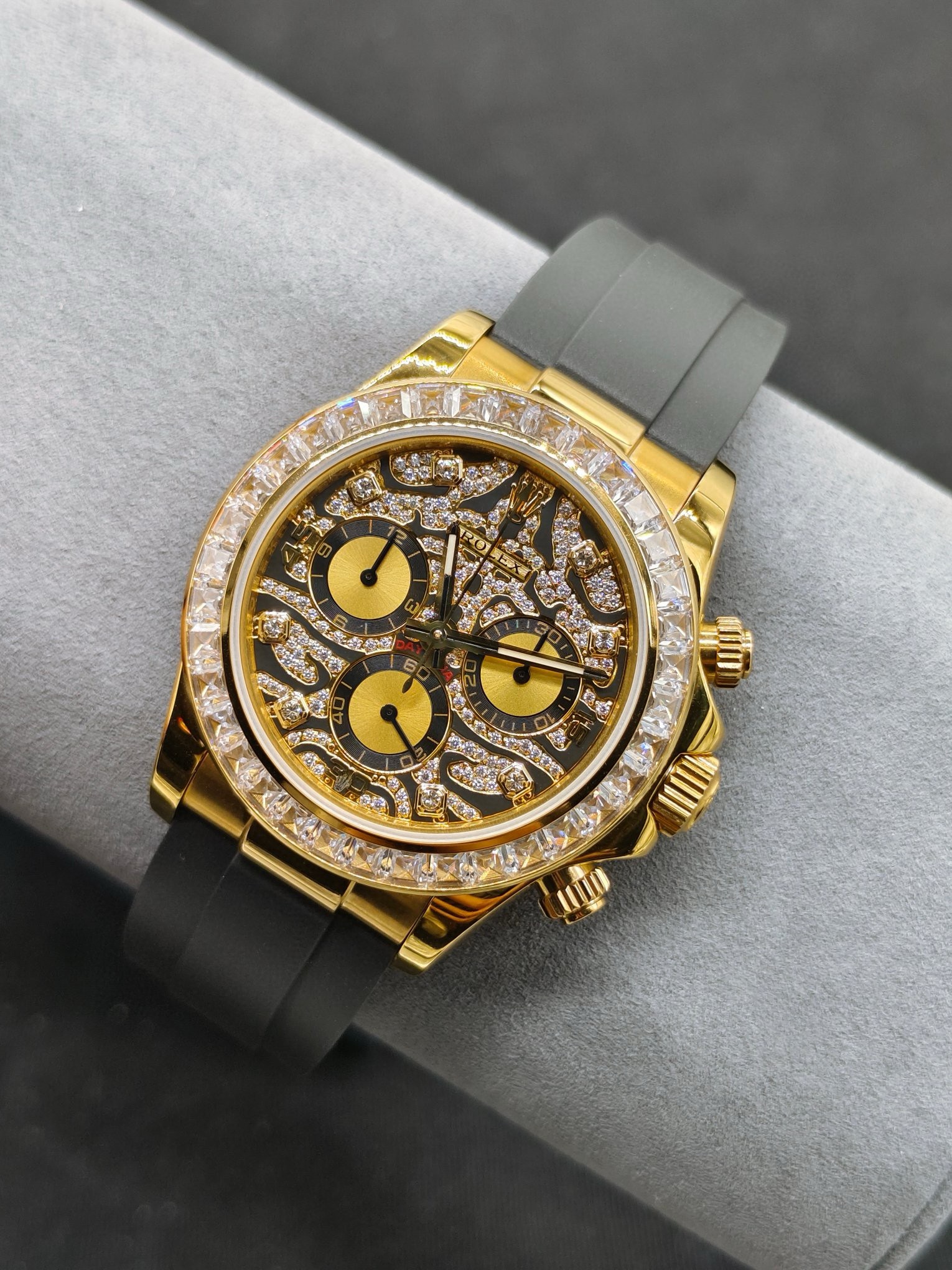 Laojia ROLEX Daytona series Daytona Eye of the Tiger tiger pattern watch. “[Eye of the Tiger] OM6 Daytona mm diameter, movement model: 7750 movement, function: timing, antimagnetic. Platinum Tiger’s Eye Gold Tiger’s Eye T-square diamond meteorite surface T square diamond circle mother-of-pearl face) equipped with: 7750 movement, size: 40. The unknown tiger Di is full of stars, all gold, tiger pattern dial, later changed to full diamonds. This watch is made of 20 T square diamonds, the diamonds on the letters and scales are selected from the same grade, so as an official customized model, the level of luxury is obvious. The tiger pattern Daytona is like the pattern on the body of a tiger, and the combination of black gold highlights the masculinity of the S1 exquisitely recommended men’s multi-functional mechanical watch.