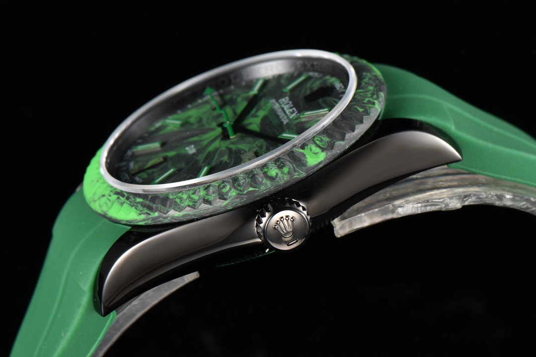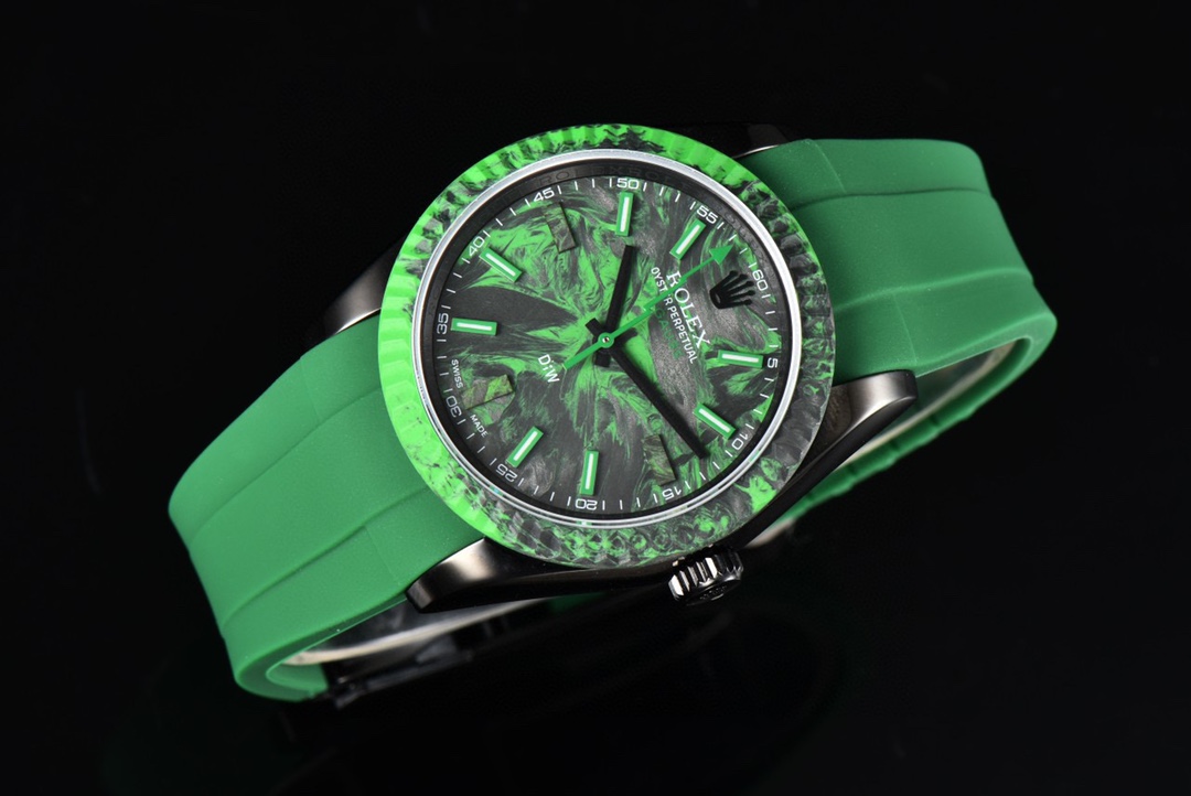 Rolex. The numerals are all made of carbon fiber. The head and hour and minute hands are made of black carbon, and the second hand is made of black steel filled with oil. In addition to the unique irregular texture of carbon fiber (not filled with oil), it creates a rich visual hierarchy and a delicate texture. Wear-resistant black steel case, buckle, and exclusive ETA2836 movement from Laojia. Paired with a soft frog rubber strap, the interweaving of ultra-light carbon fiber and fabric strap comfort enhances the overall wearing experience of the watch.