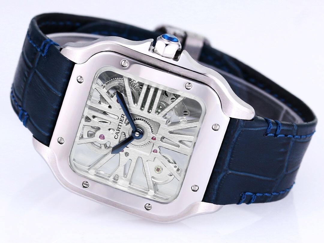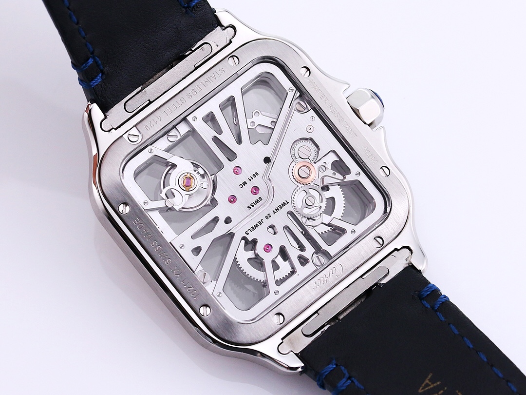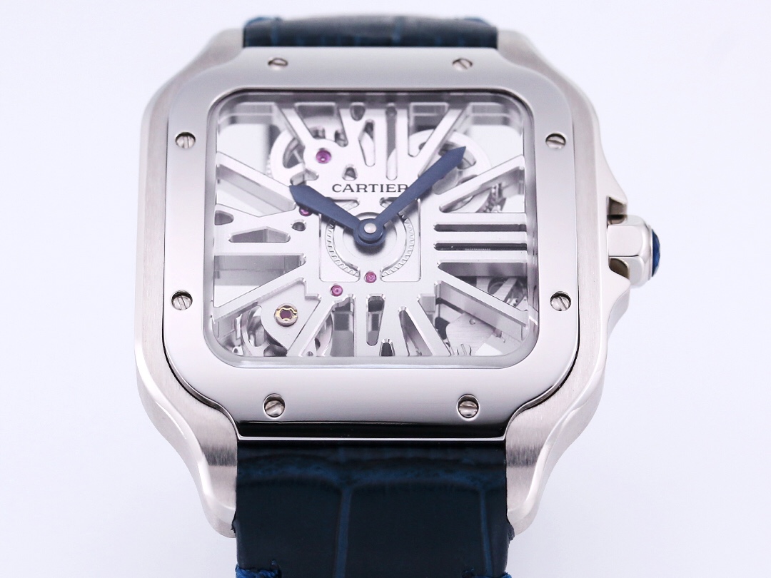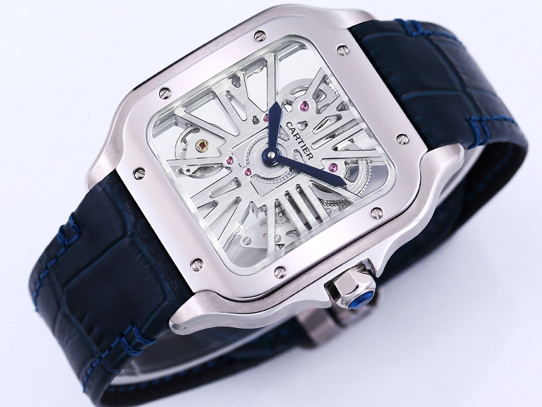 Santos Skeleton Series, the first TW to create the most powerful modified mechanical movement, case thickness: 9.08 mm, dial color: skeleton dial shape: square, SKU: black, silver silver ring, silver rose ring, silver gold ring, strap color: stainless steel strap, buckle type: double folding clasp.