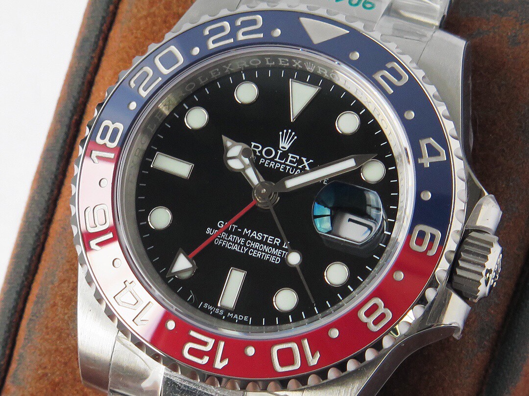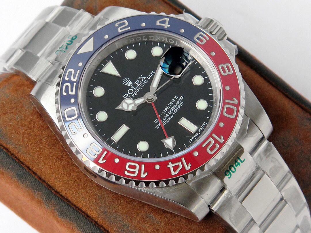 The GMT-Master II GMT series watches launched this time are made of LN_ BLNR_ m mm 4-millimeter consumable stainless steel, which restores the excellent structure of the genuine consumable case. It is first-class polished and has the same waterproof performance as the genuine product. 2. Equipped with a high-tech two-way rotating ceramic bezel. 3. With traditional hour, minute and second hands, triangular arrow 24-hour hand, and two-way rotating outer ring. Can display two time zones at the same time. [Movement] It uses a three-blue hairspring integrated movement. The debugging and winding are consistent with the direction and feel of the original movement.