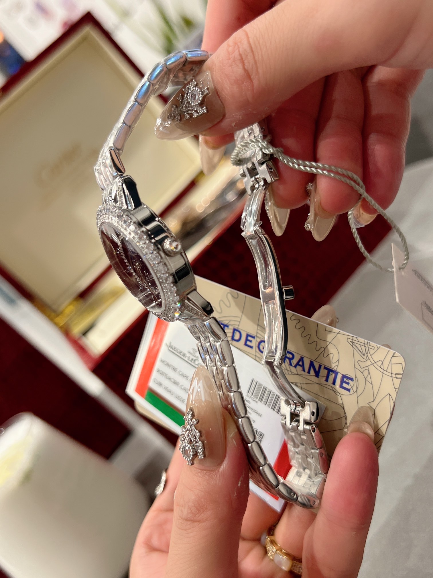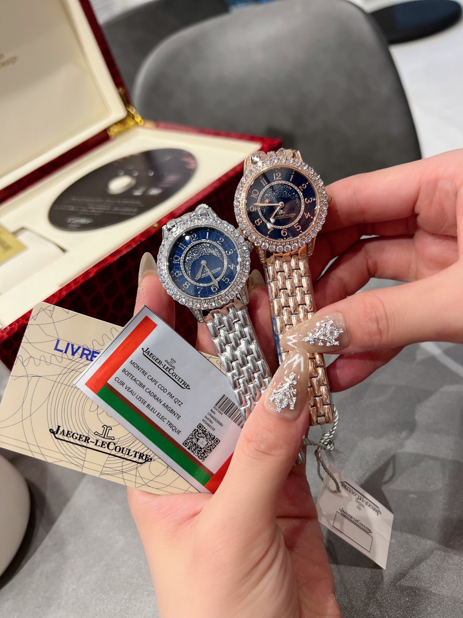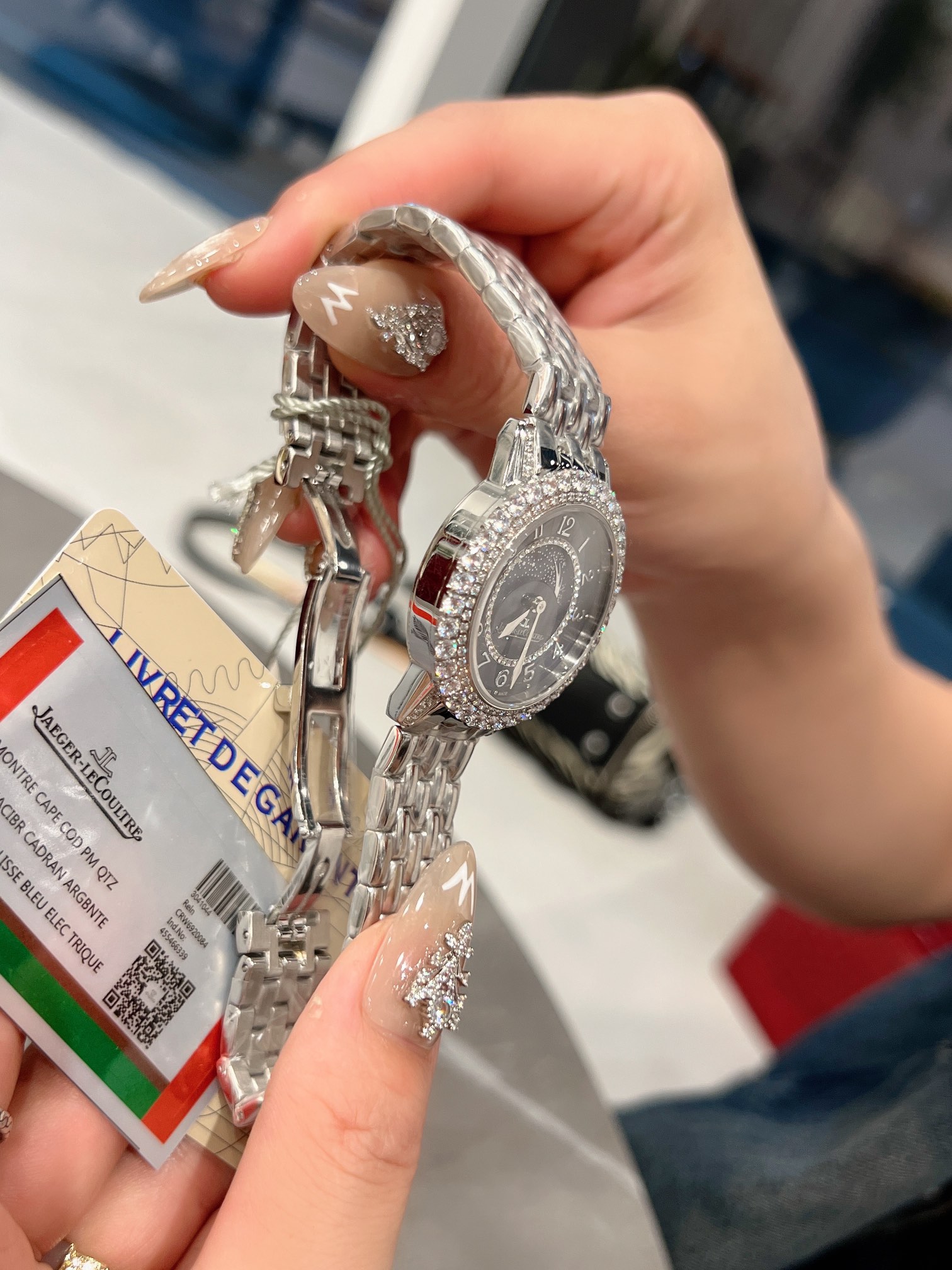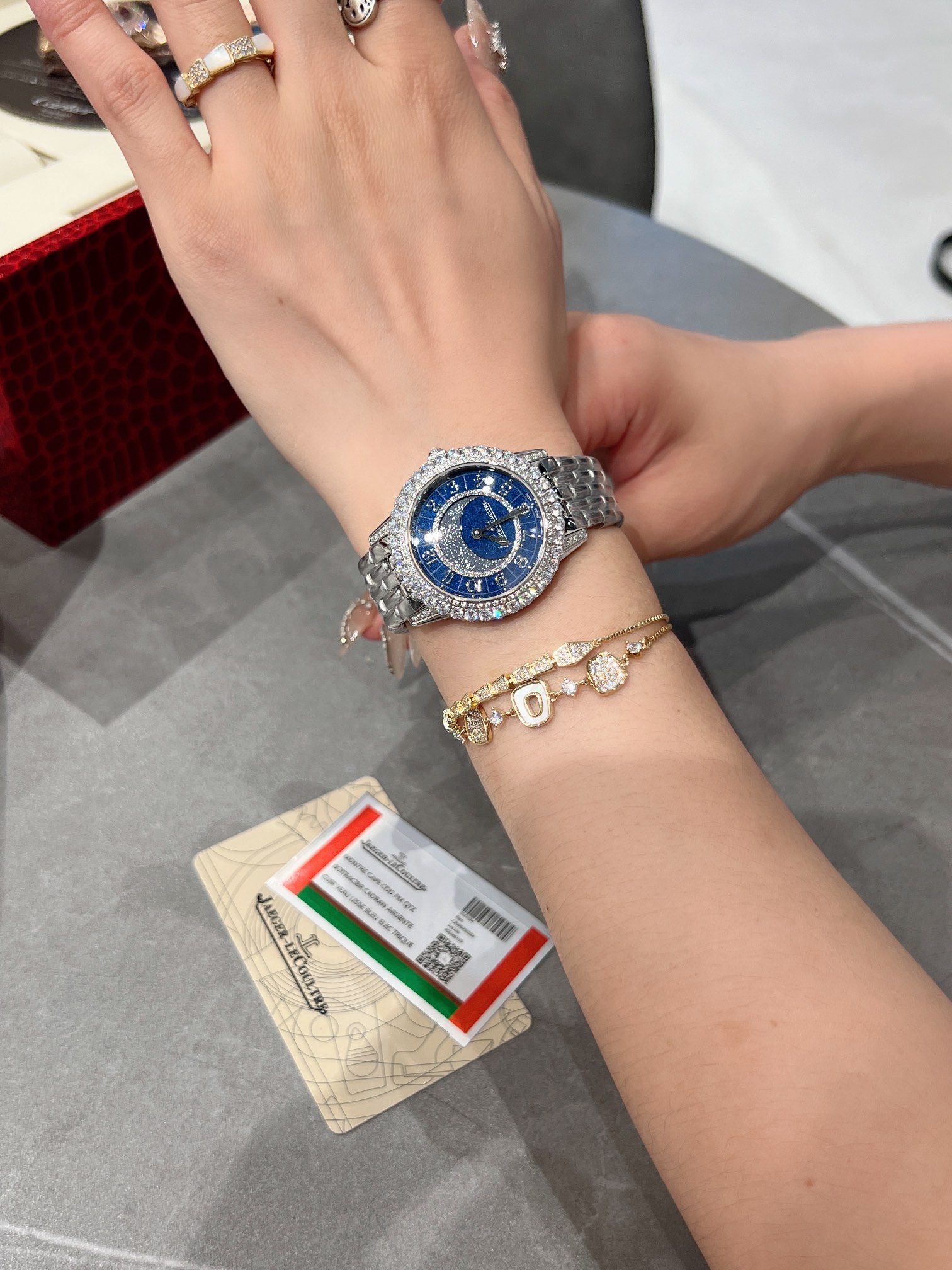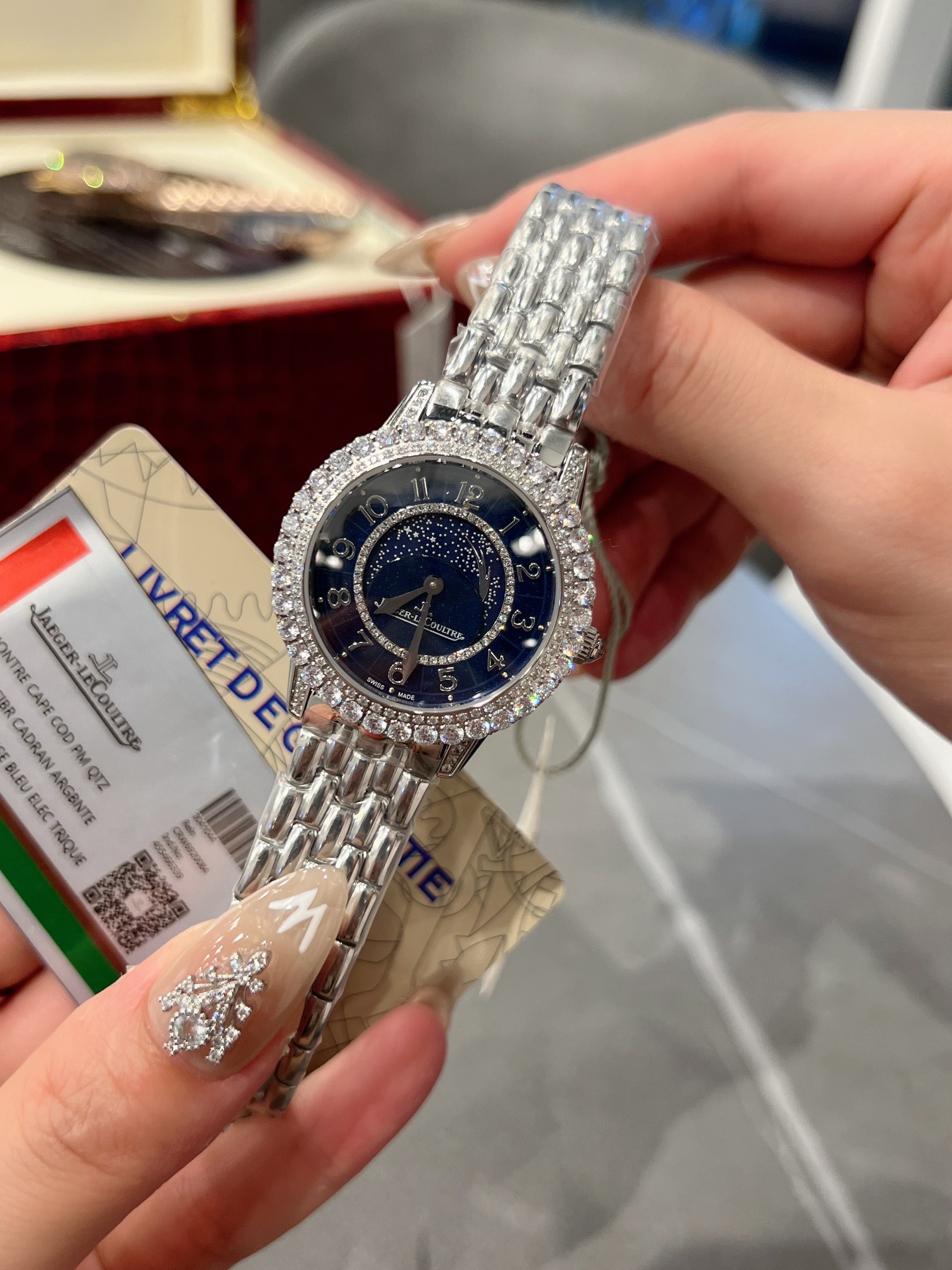 The Jaeger-LeCoultre Date Series Meteor Jewelry Watch embodies Jaeger-LeCoultre’s exquisite core time art. Jewelry craftsmen carefully polish and inlaid diamonds on the bezel and dial, making every frame and every second of time sparkle and bewitching. The enamel starry sky dial looks like a charming starry sky against the backdrop of beautiful diamonds on the outer ring! Equipped with imported quartz movement, arched sapphire mirror, imported calfskin strap and crocodile leather strap with original folding buckle. Case diameter 34mm, thickness 11mm🧚‍️🧚‍️🧚‍️