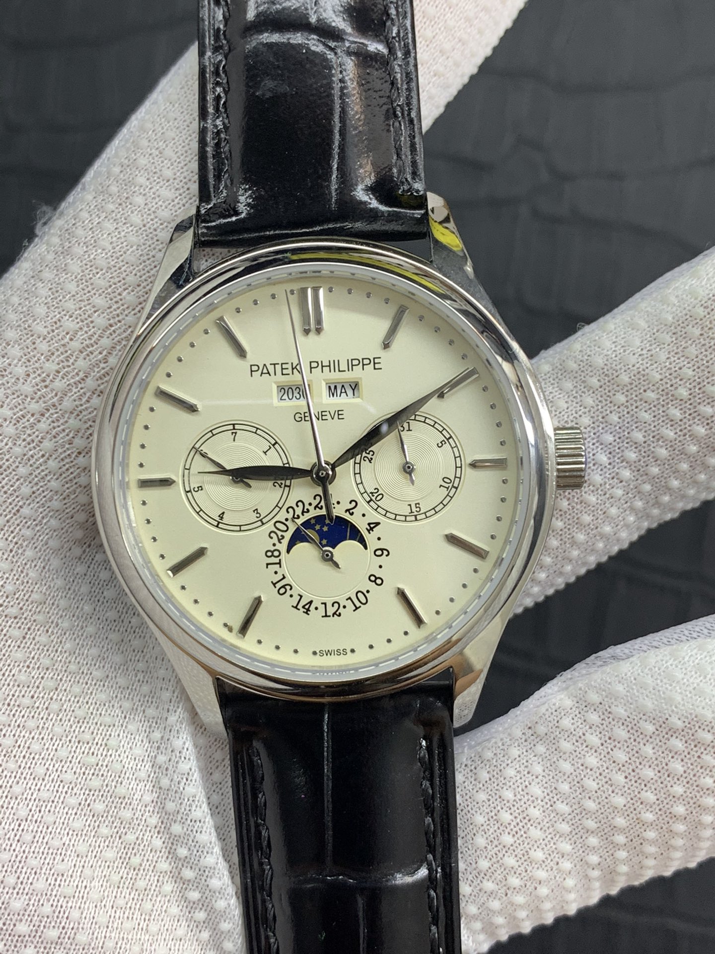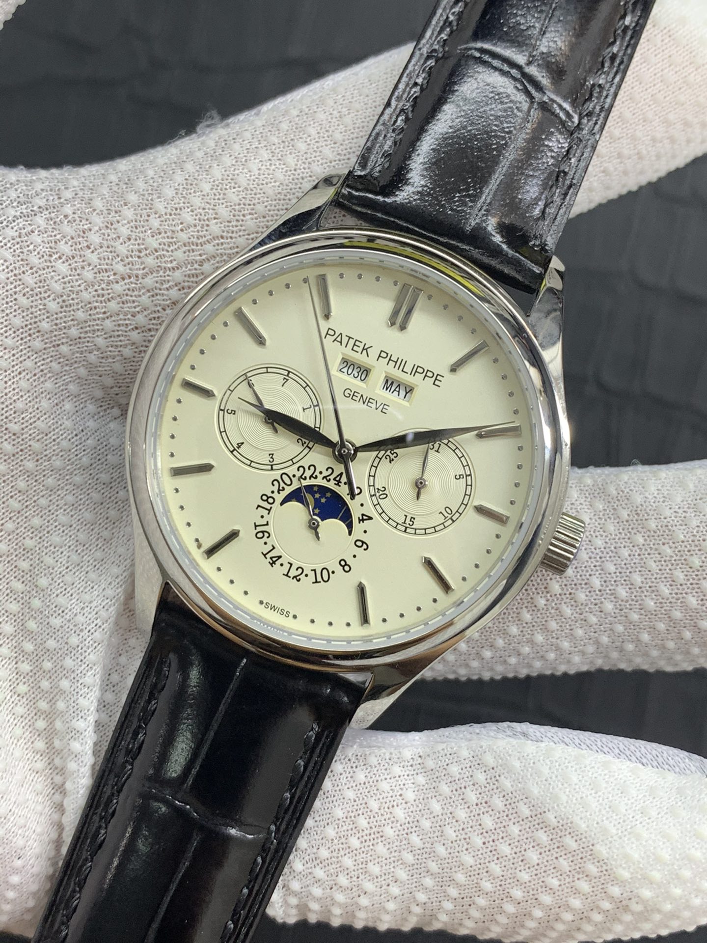 The Patek Philippe super complex function chronograph series was carefully designed by the team for three years, regardless of cost, daring to be the first, striving for perfection, overcoming many difficulties, breaking through multi-layered technical bottlenecks, and designing for the first time a model that integrates complex functions such as year, month, week, calendar, moon phase, etc. The movement model is 29-5mm, and the thickness is A-level. Photographed in pure natural light. Zero P picture produced by AFD
