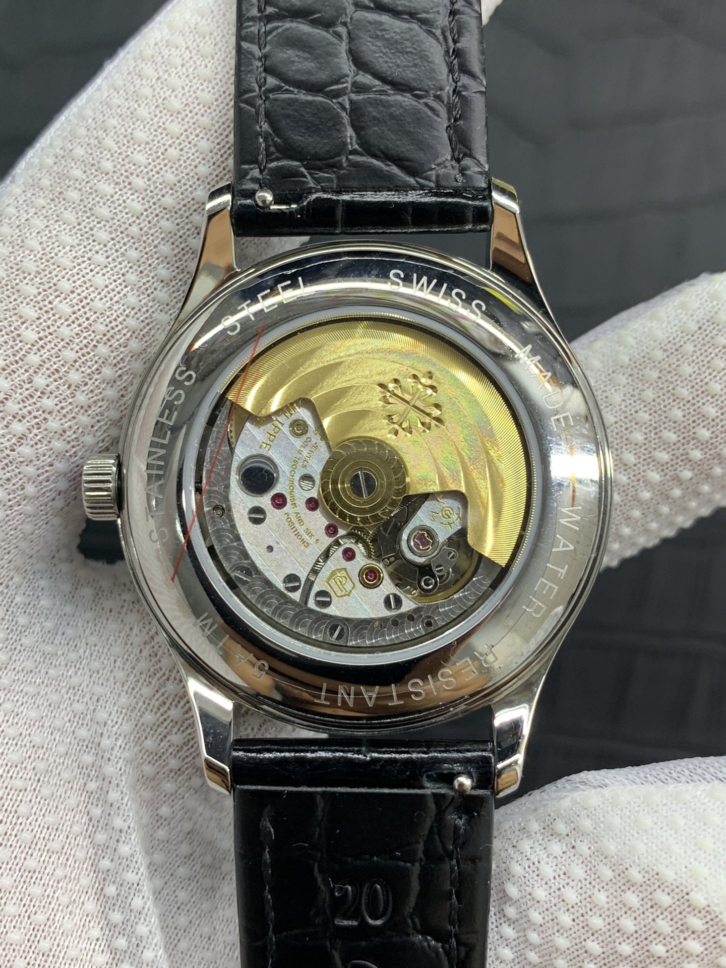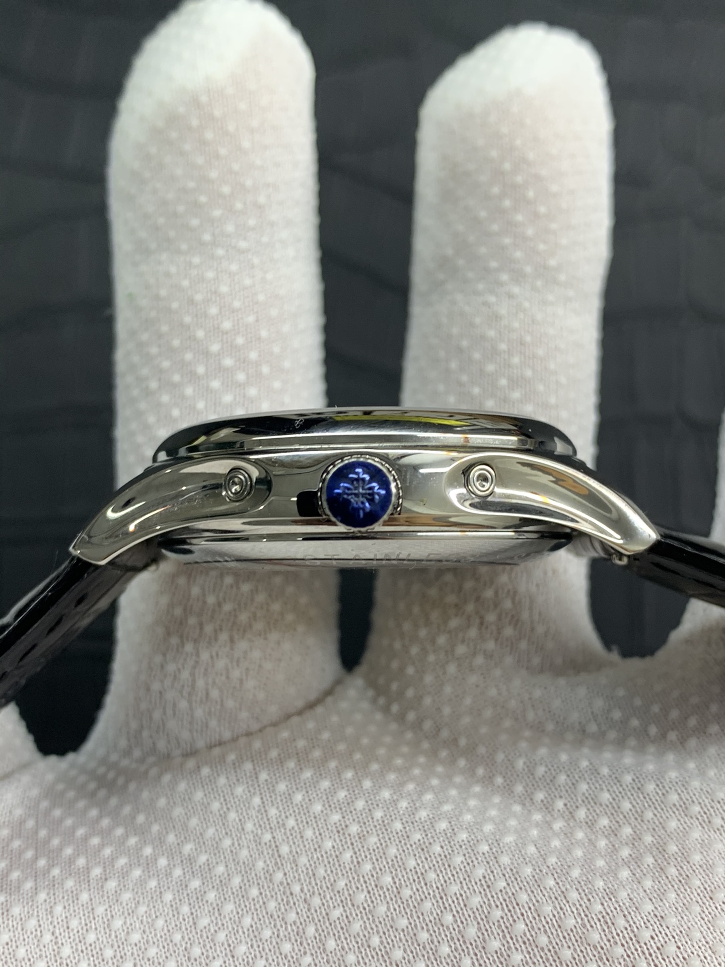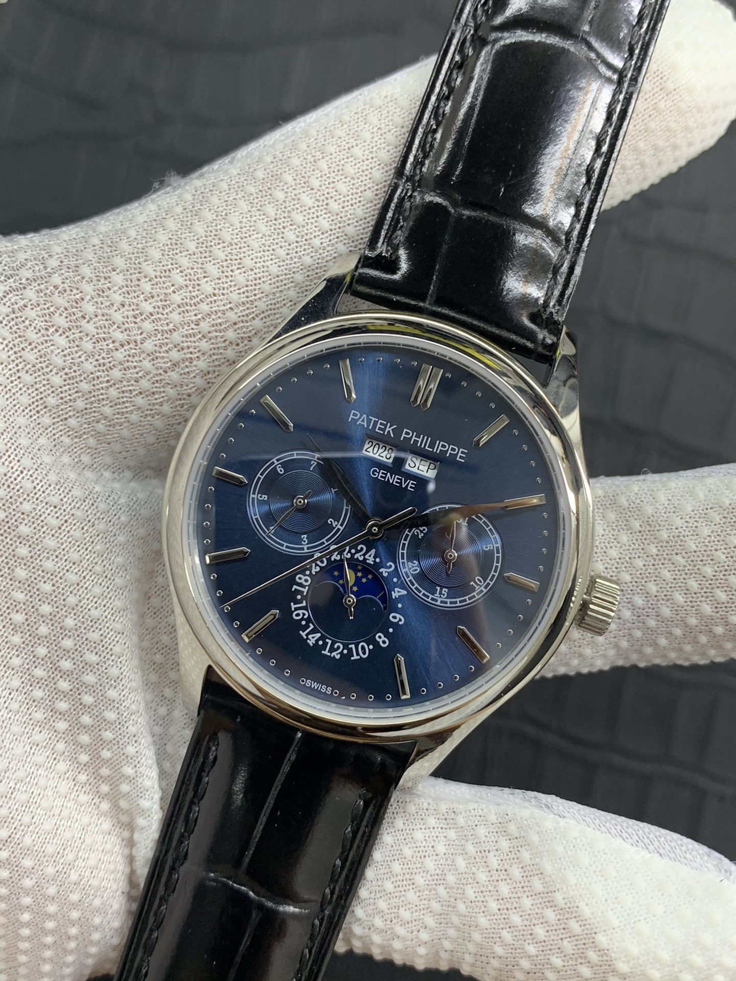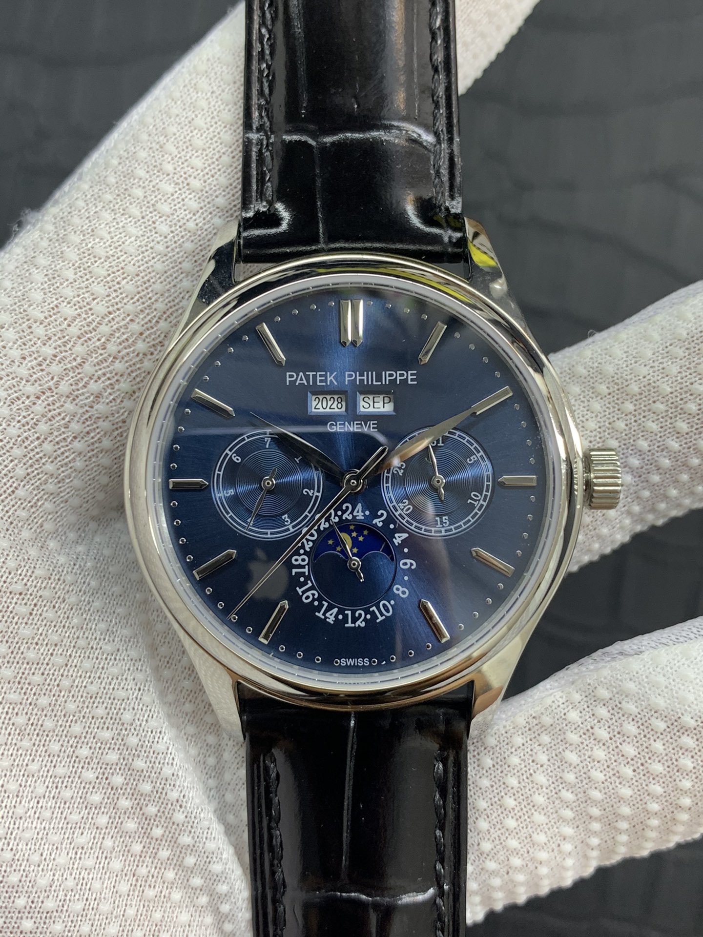 The Patek Philippe super complex function chronograph series was carefully designed by the team for three years, regardless of cost, daring to be the first, striving for perfection, overcoming many difficulties, breaking through multi-layered technical bottlenecks, and designing for the first time a model that integrates complex functions such as year, month, week, calendar, moon phase, etc. The movement model is 29-5mm, and the thickness is A-level. Photographed in pure natural light. Zero P picture produced by AFD