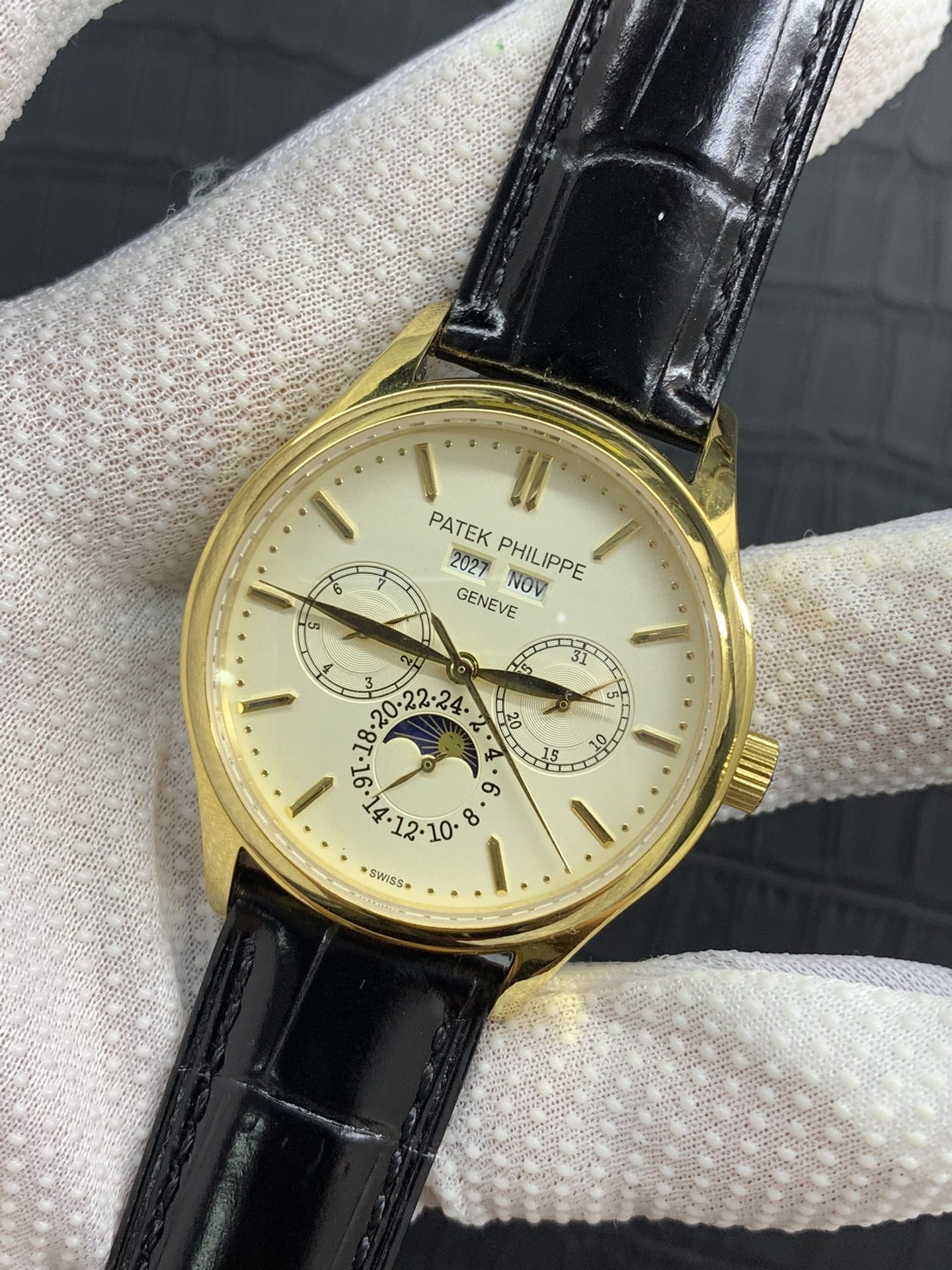 The Patek Philippe super complex function chronograph series was carefully designed by the team for three years, regardless of cost, daring to be the first, striving for perfection, overcoming many difficulties, breaking through multi-layered technical bottlenecks, and designing for the first time a model that integrates complex functions such as year, month, week, calendar, moon phase, etc. The movement model is 29-5mm, and the thickness is A-level. Photographed in pure natural light. Zero P picture produced by AFD