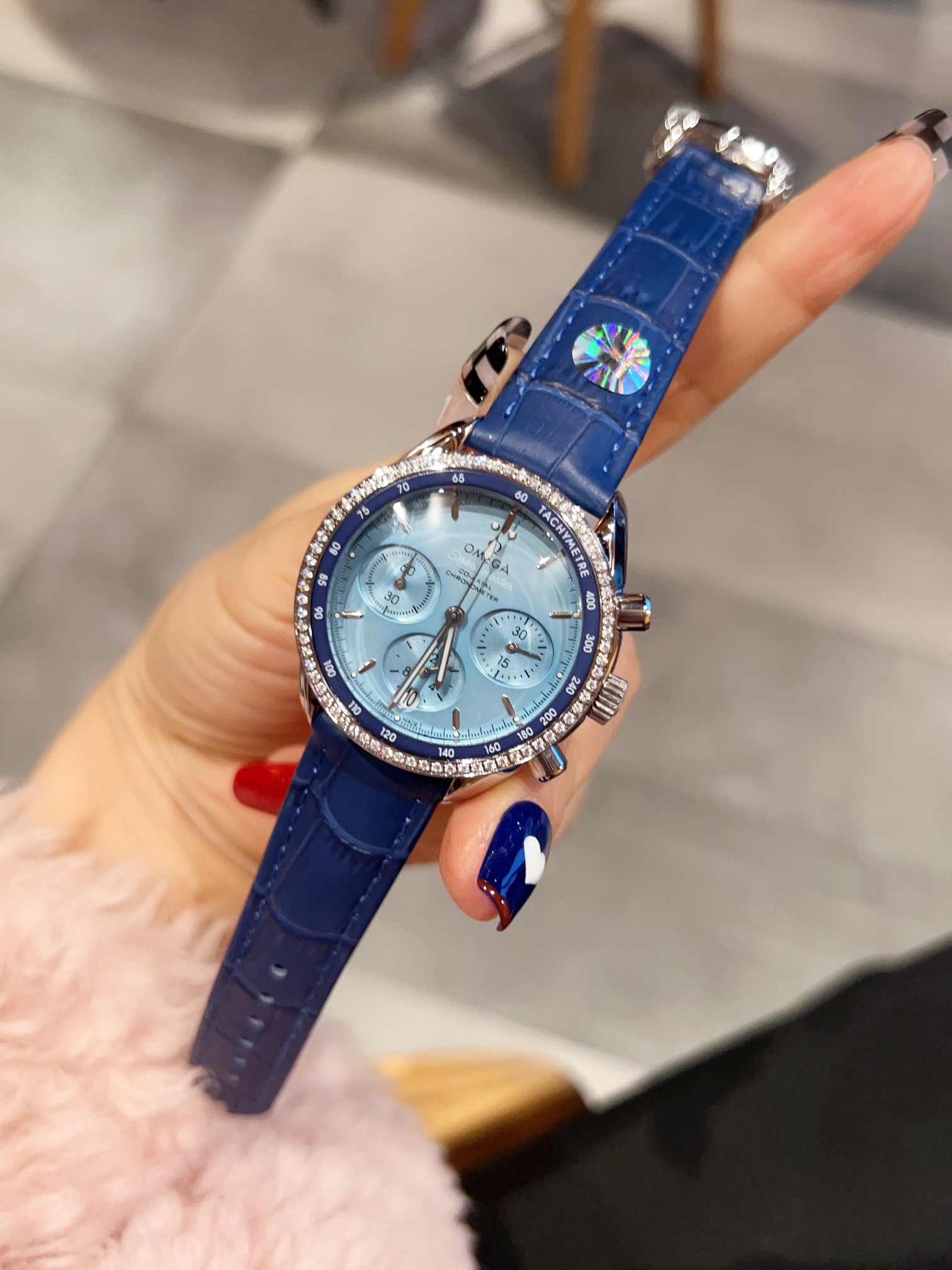 The European Speedmaster series mm’s stainless steel case is paired with a white belt. The color is gentle and elegant. The special double bezel design continues the prototype Speedmaster’s professional speedometer ring. The outer ring is decorated with a speedometer scale. The dial has three oval-shaped exquisite diamond-rimmed small dials, showing a harmonious beauty of hardness and softness. The white mother-of-pearl dial is warm and elegant, with rose-pink hands, and it will make a girl’s heart come naturally. It is simple and refreshing to wear, highlighting its elegance and is also very versatile. It cleverly combines the dynamics of the Speedmaster Moonwatch with the elegant femininity. 🧚‍️🧚‍️🧚‍️