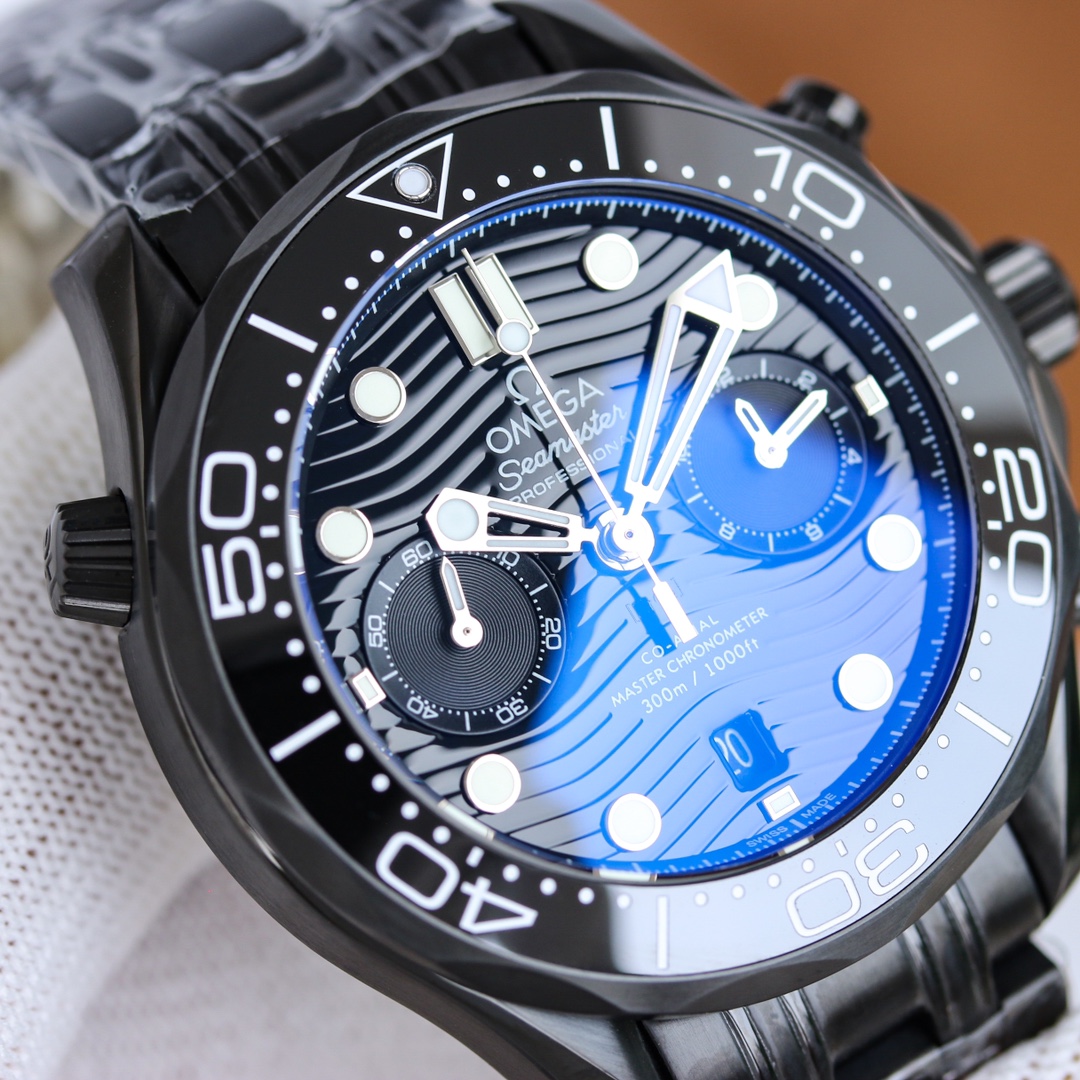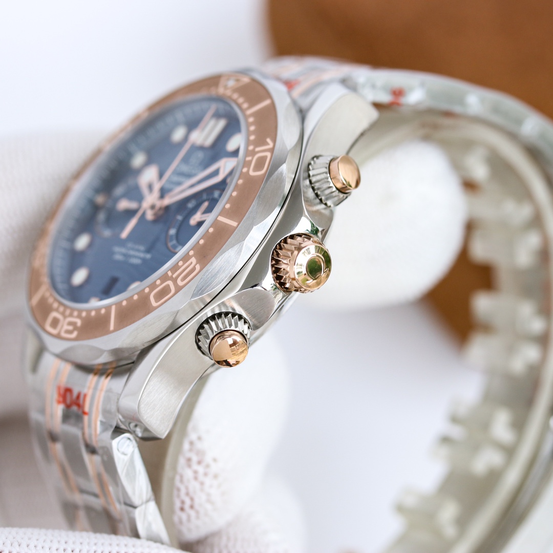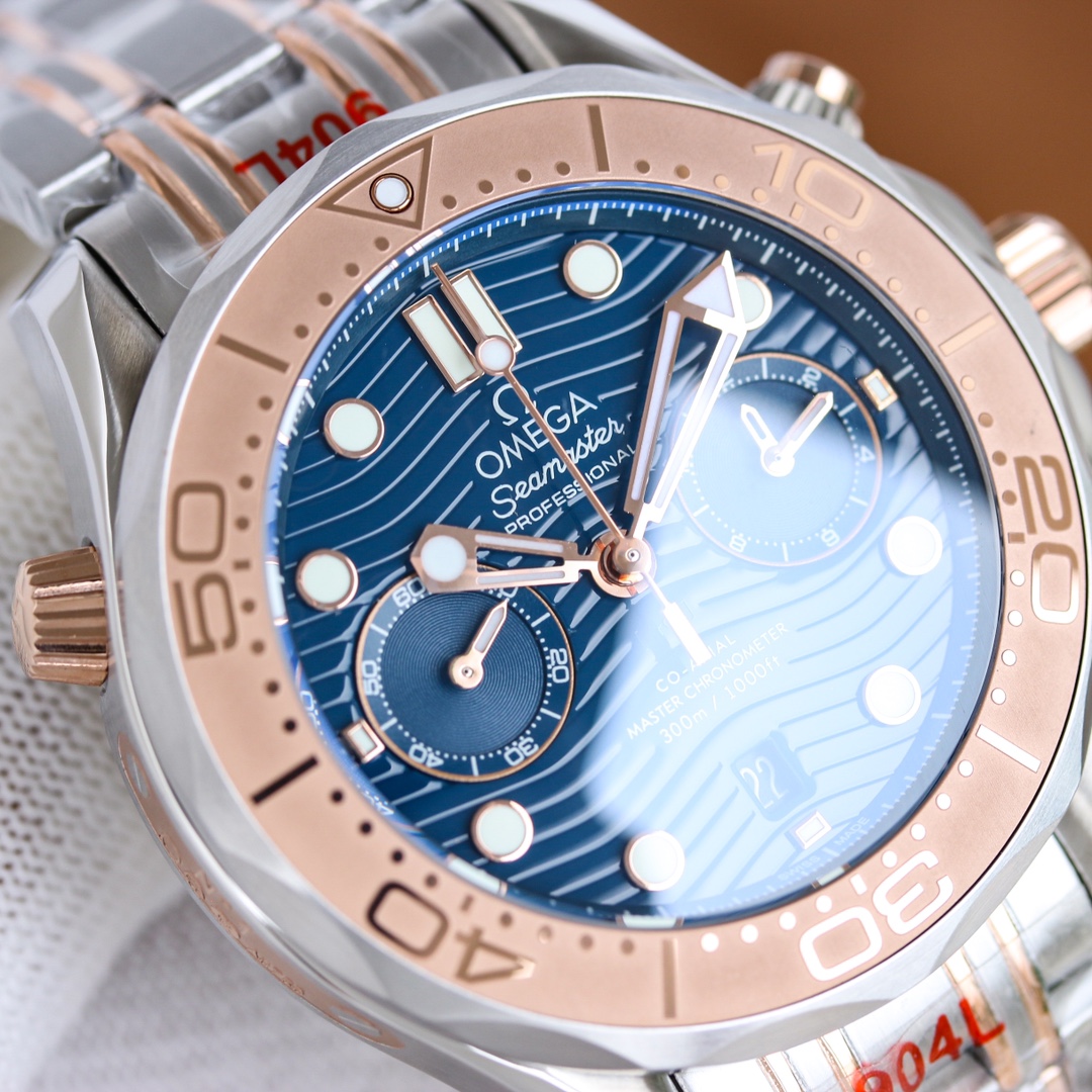 TW Europe’s new Marine Series 0m chronograph men’s watch is the highest version of the chronograph 0m chronograph movement currently on the market, with a 44mm 904 fine steel case and a natural imported rubber strap. OMEGA’s exclusive Sedna gold is naturally the most important decorative metal. You can see this charming and warm golden red on the bezel, crown buttons, and dial. The scale ring of the bezel is laser-ablated to create a sandblasting effect, and the polished numbers and scales protrude like reliefs. 2: The blue zirconia ceramic dial is decorated with a wavy texture, with hollow hour and minute hands and a central chronograph second hand. It has a 0-Zhizhen Observatory self-winding movement with a swing frequency of 20.28800 vph. Double barrels in series provide a 60-hour power reserve. The sapphire case back is decorated with a white lacquered OMEGA seahorse pattern.